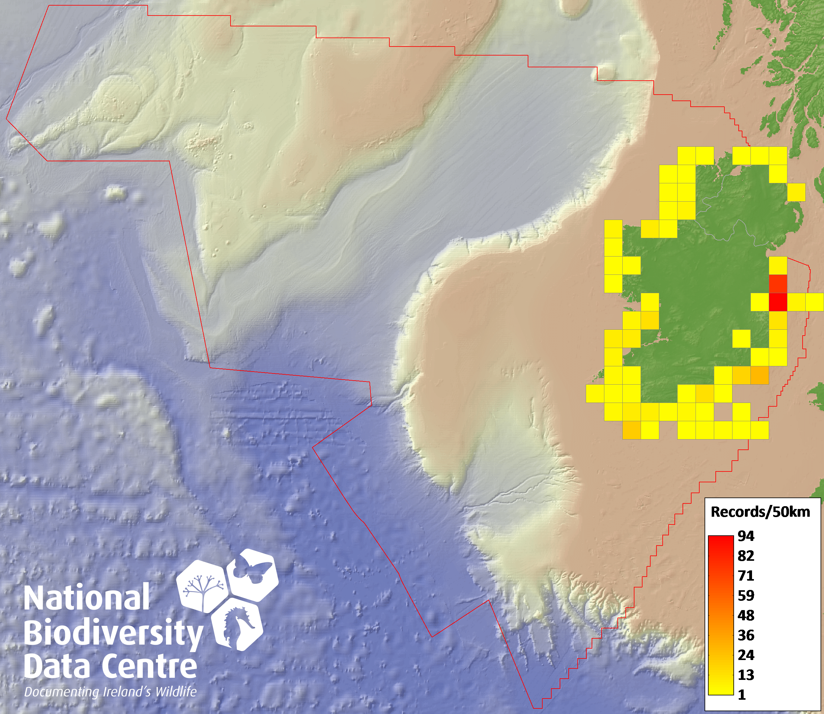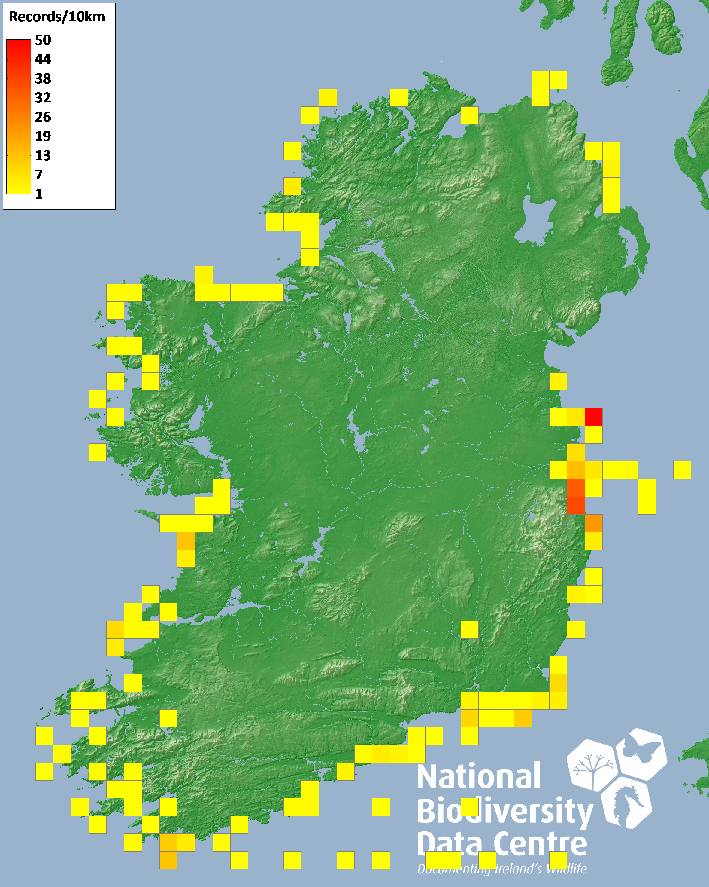 Distribution of the number of records recorded within each 10km grid square (ITM).Marine Map - 50km