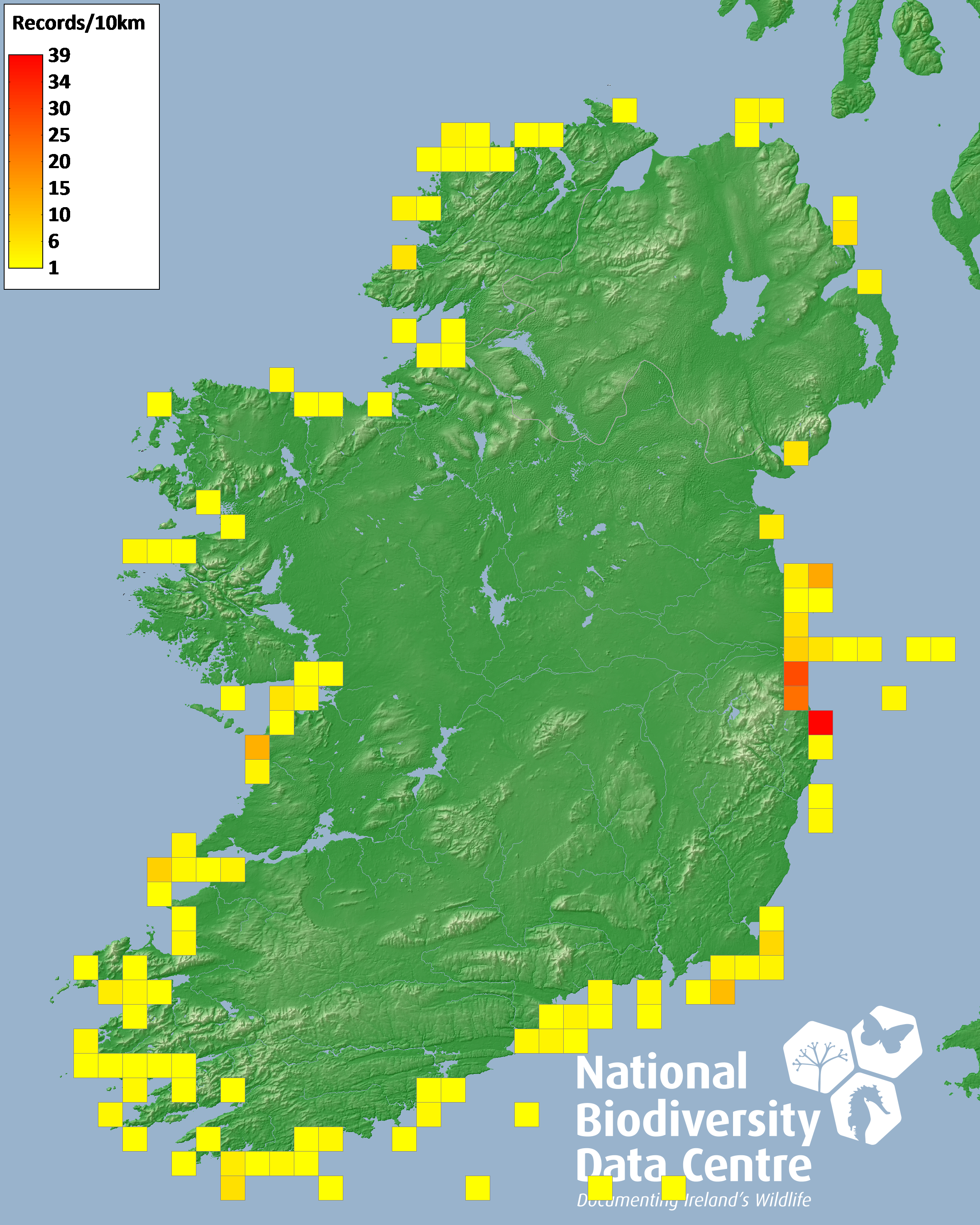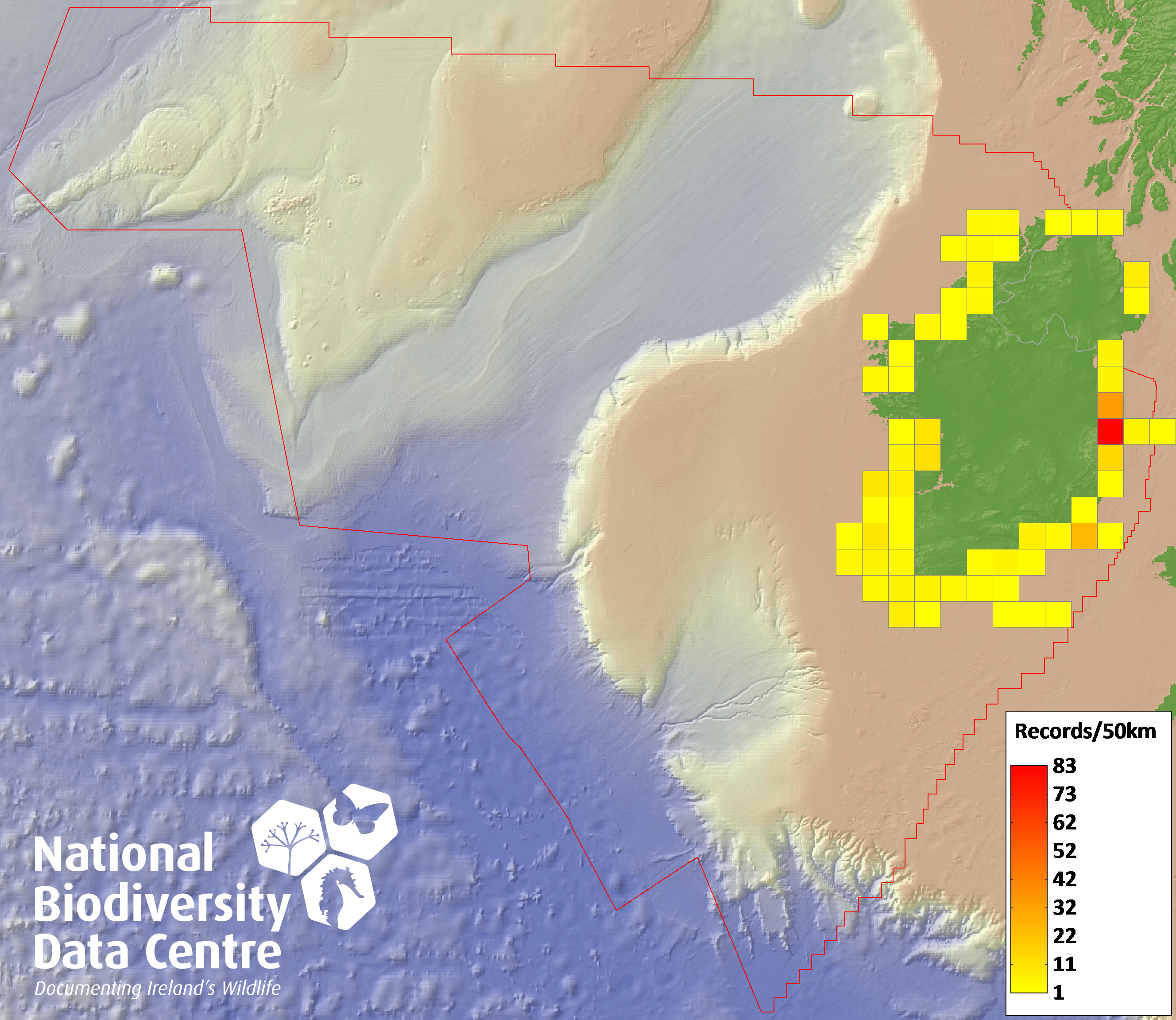 Distribution of the number of records recorded within each 10km grid square (ITM).Marine Map - 50km