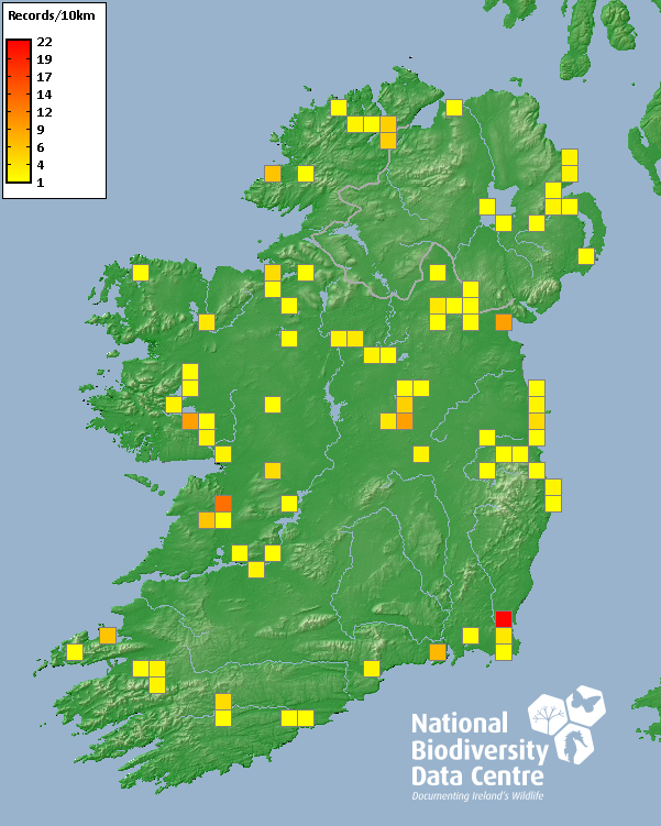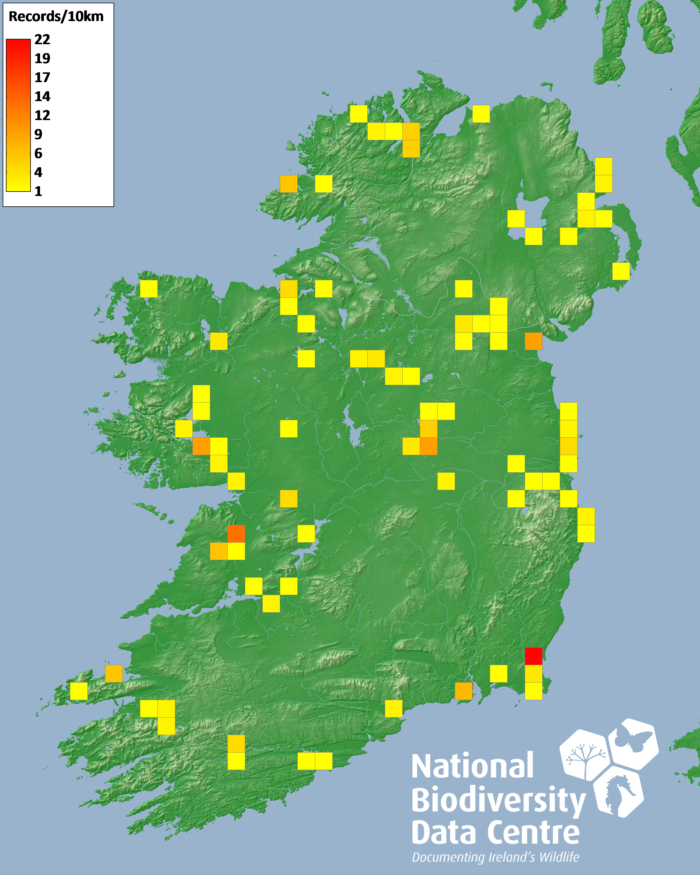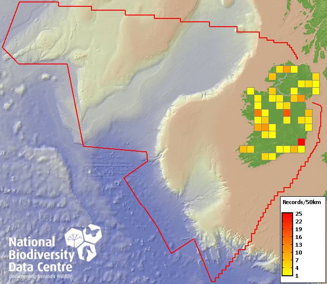 Distribution of the number of records recorded within each 10km grid square (ITM).Marine Map - 50km
