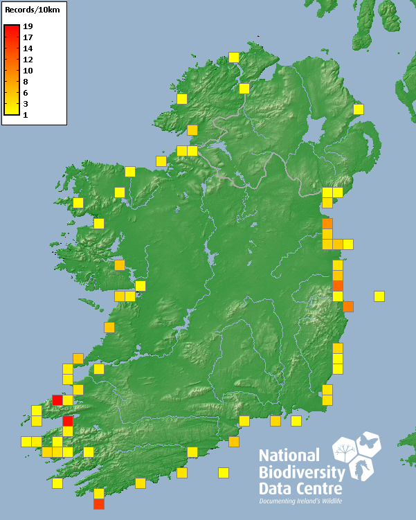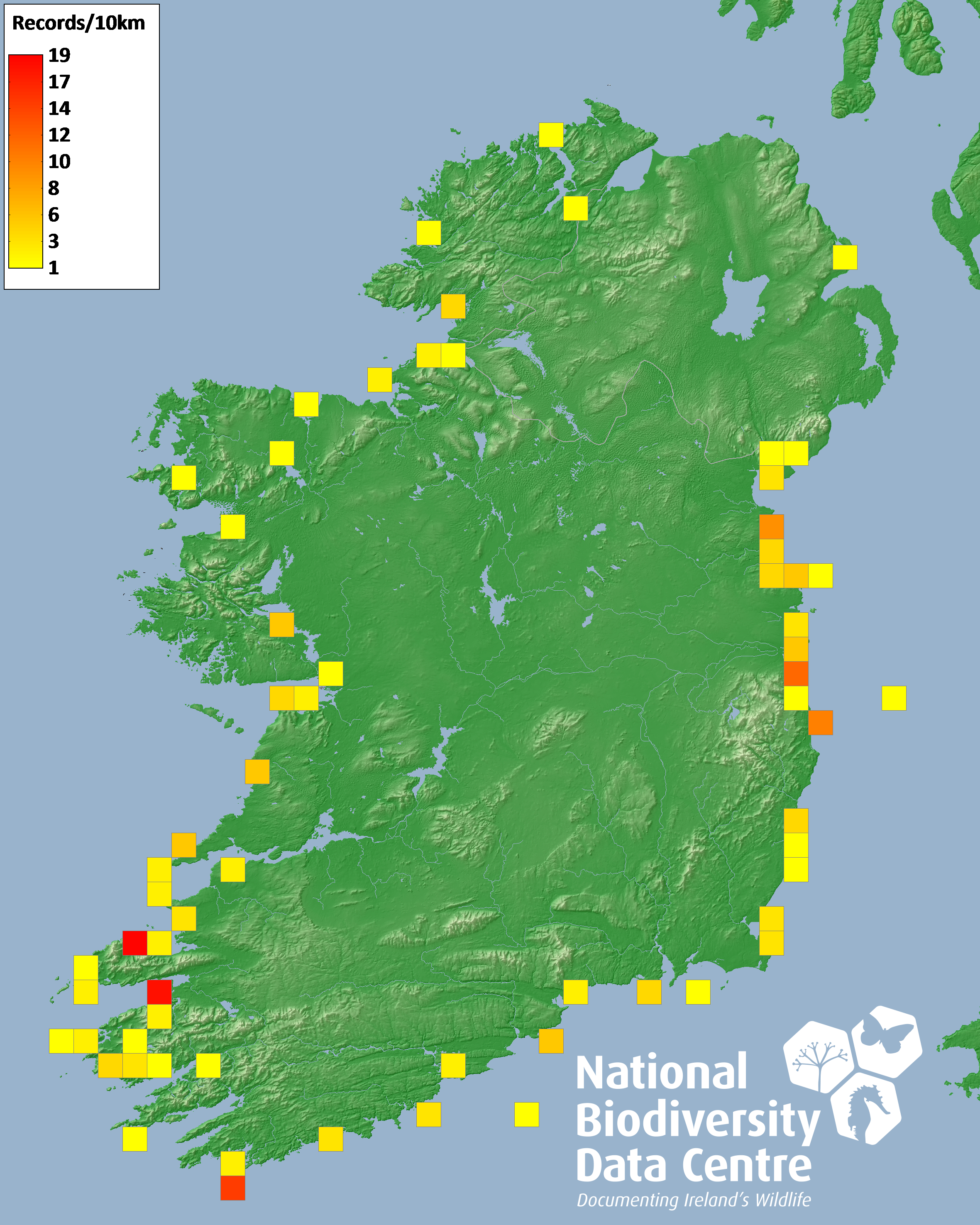 Distribution of the number of records recorded within each 10km grid square (ITM).Marine Map - 50km