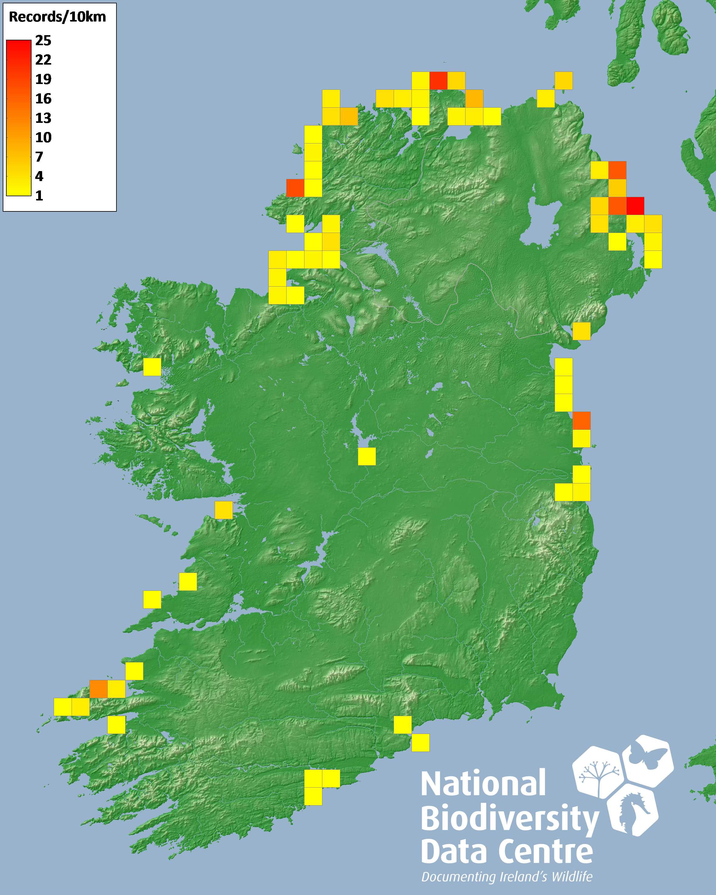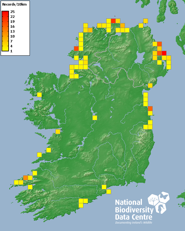 Distribution of the number of records recorded within each 10km grid square (ITM).Marine Map - 50km
