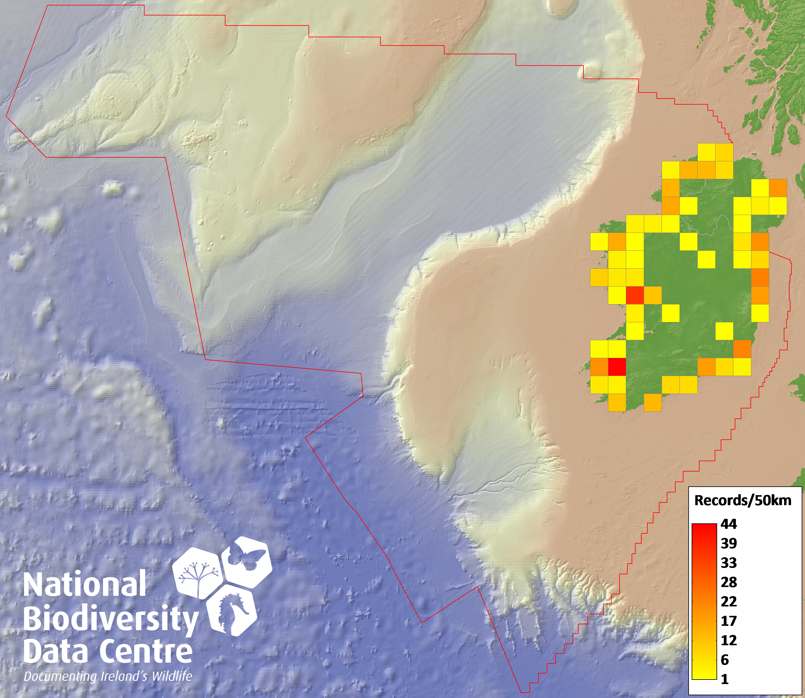 Distribution of the number of records recorded within each 10km grid square (ITM).Marine Map - 50km