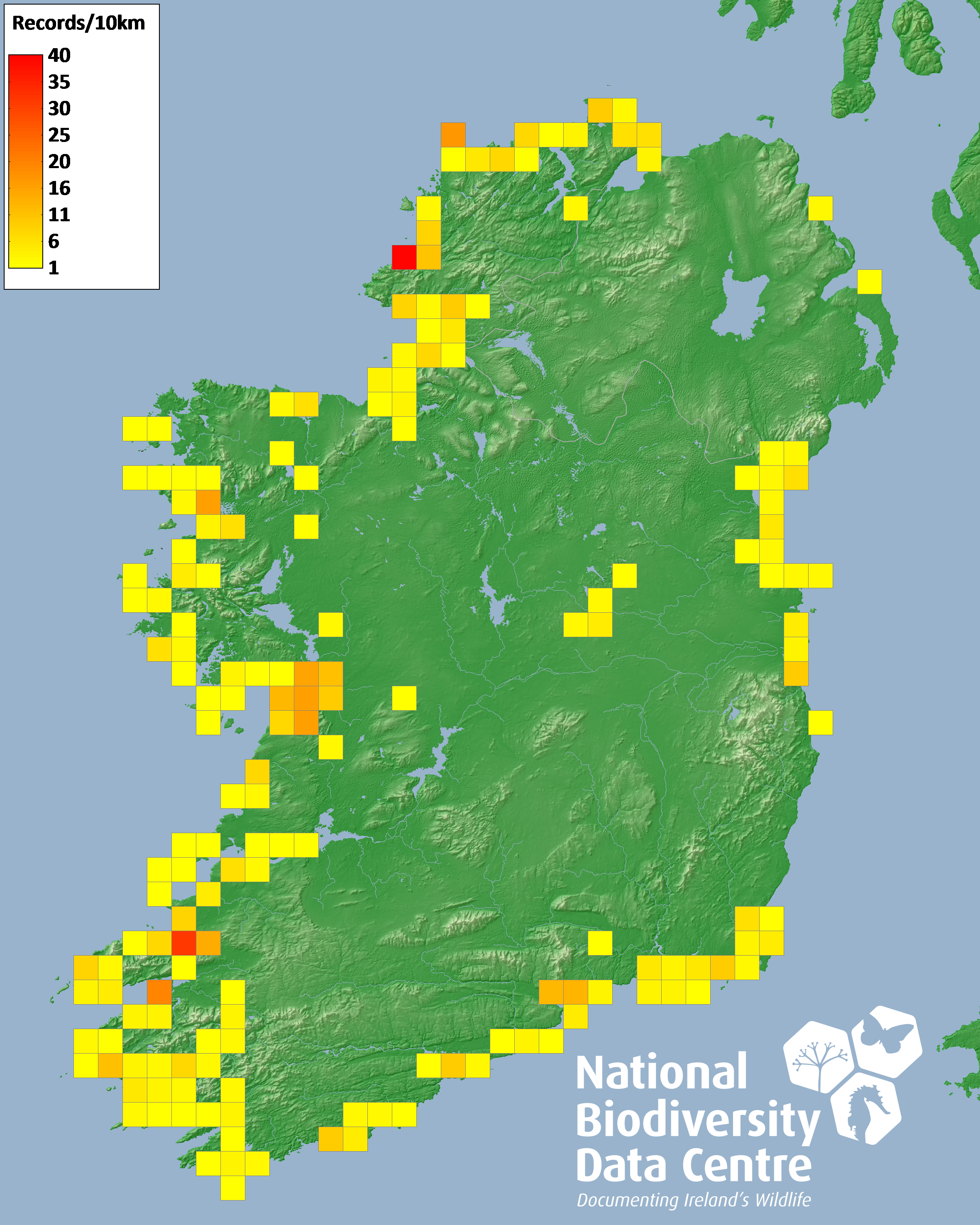 Distribution of the number of records recorded within each 10km grid square (ITM).Marine Map - 50km
