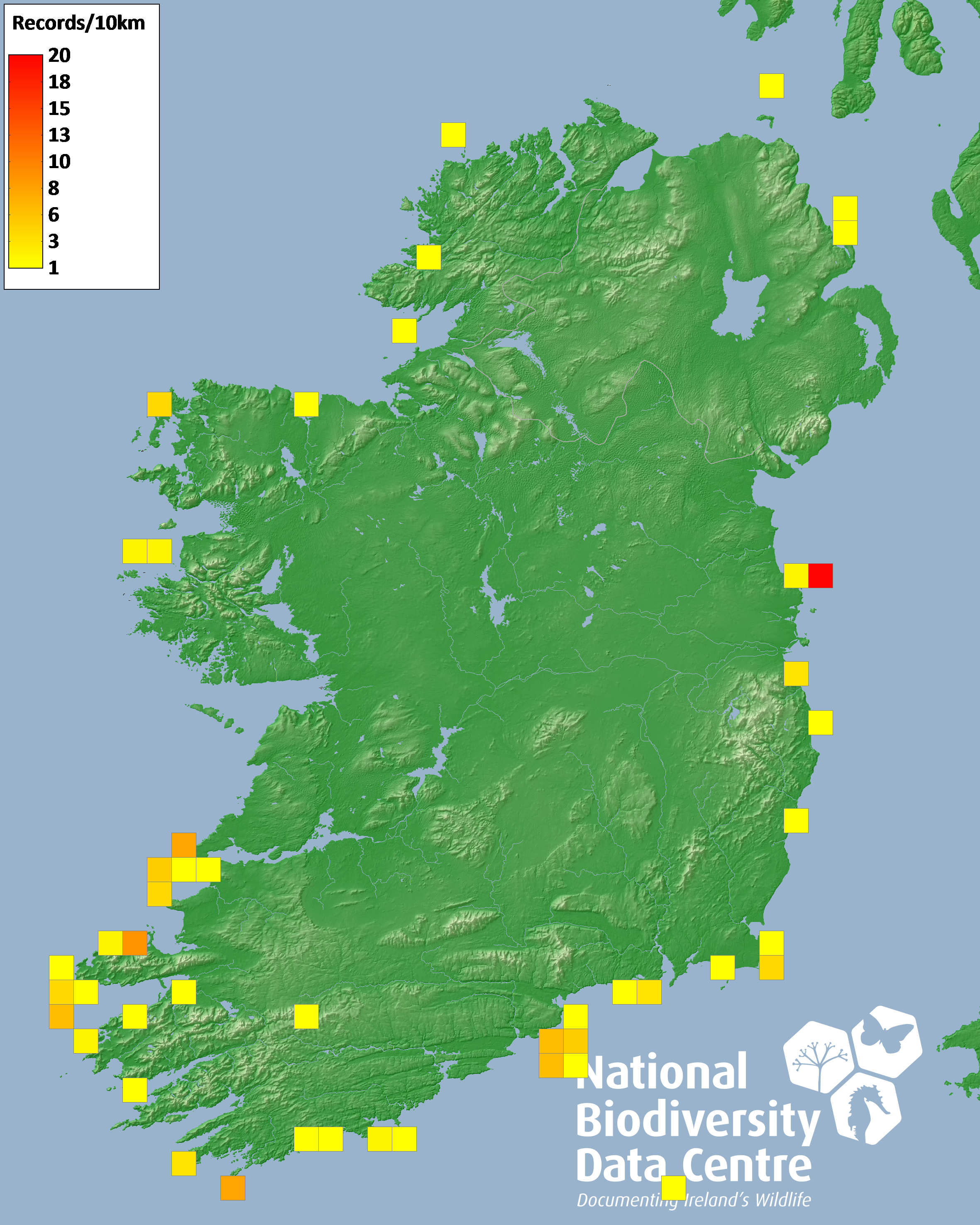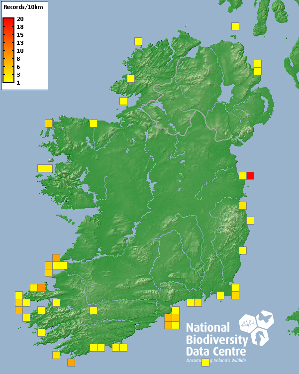 Distribution of the number of records recorded within each 10km grid square (ITM).Marine Map - 50km