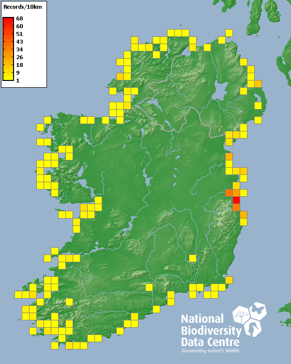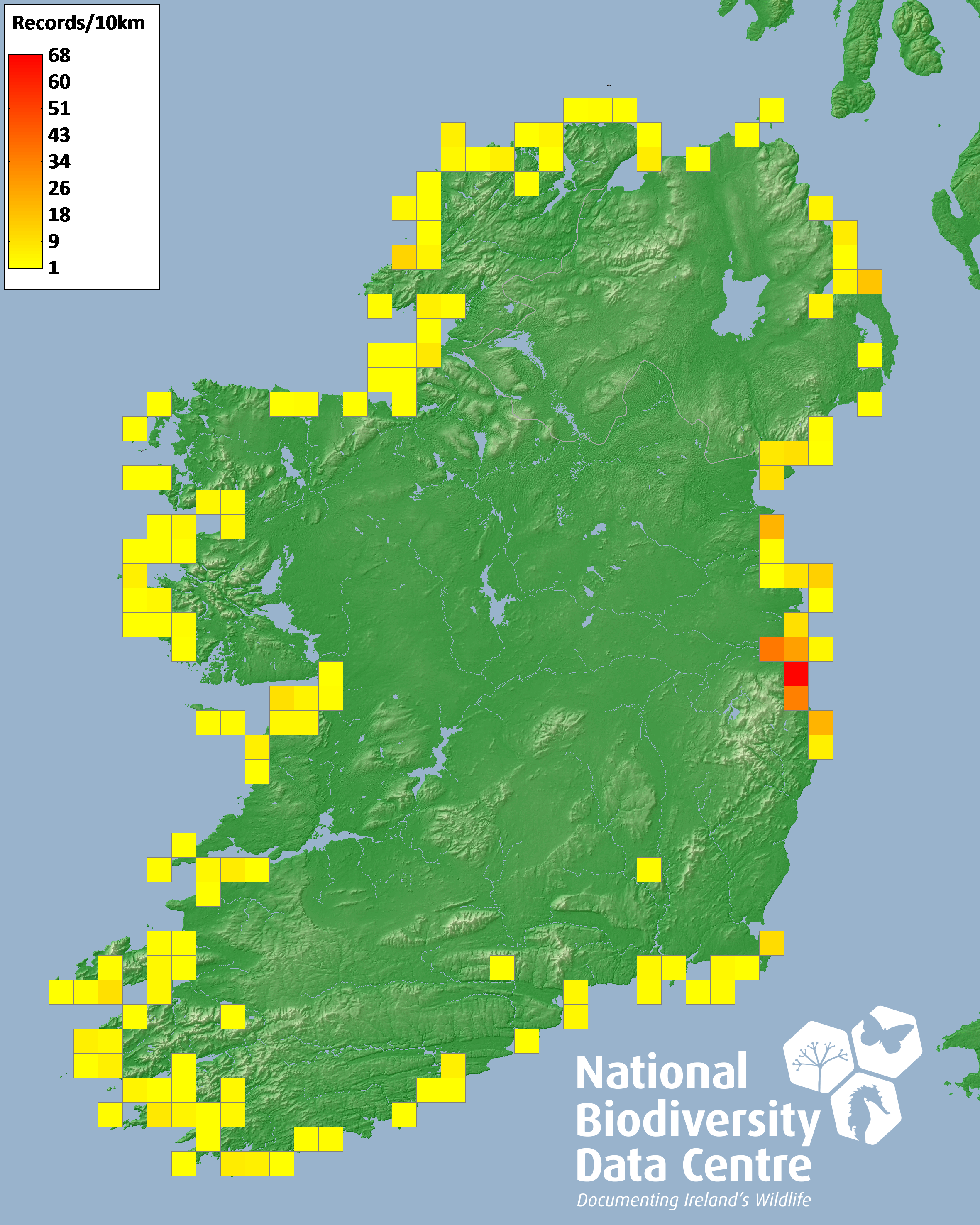 Distribution of the number of records recorded within each 10km grid square (ITM).Marine Map - 50km