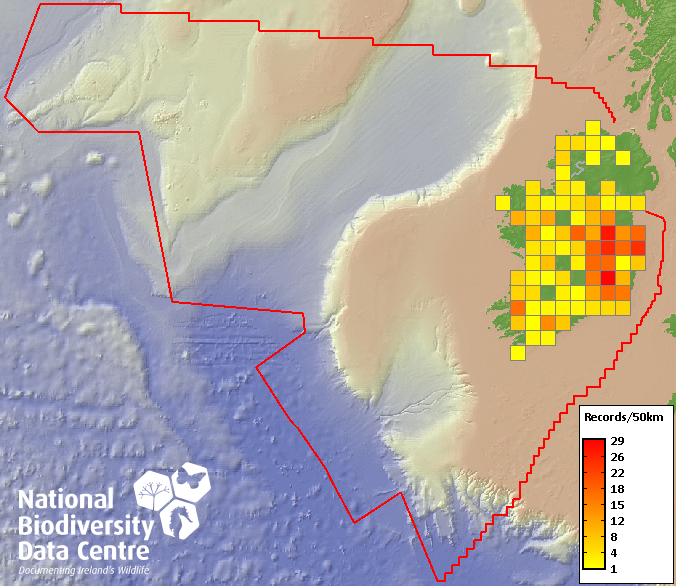 Distribution of the number of records recorded within each 10km grid square (ITM).Marine Map - 50km