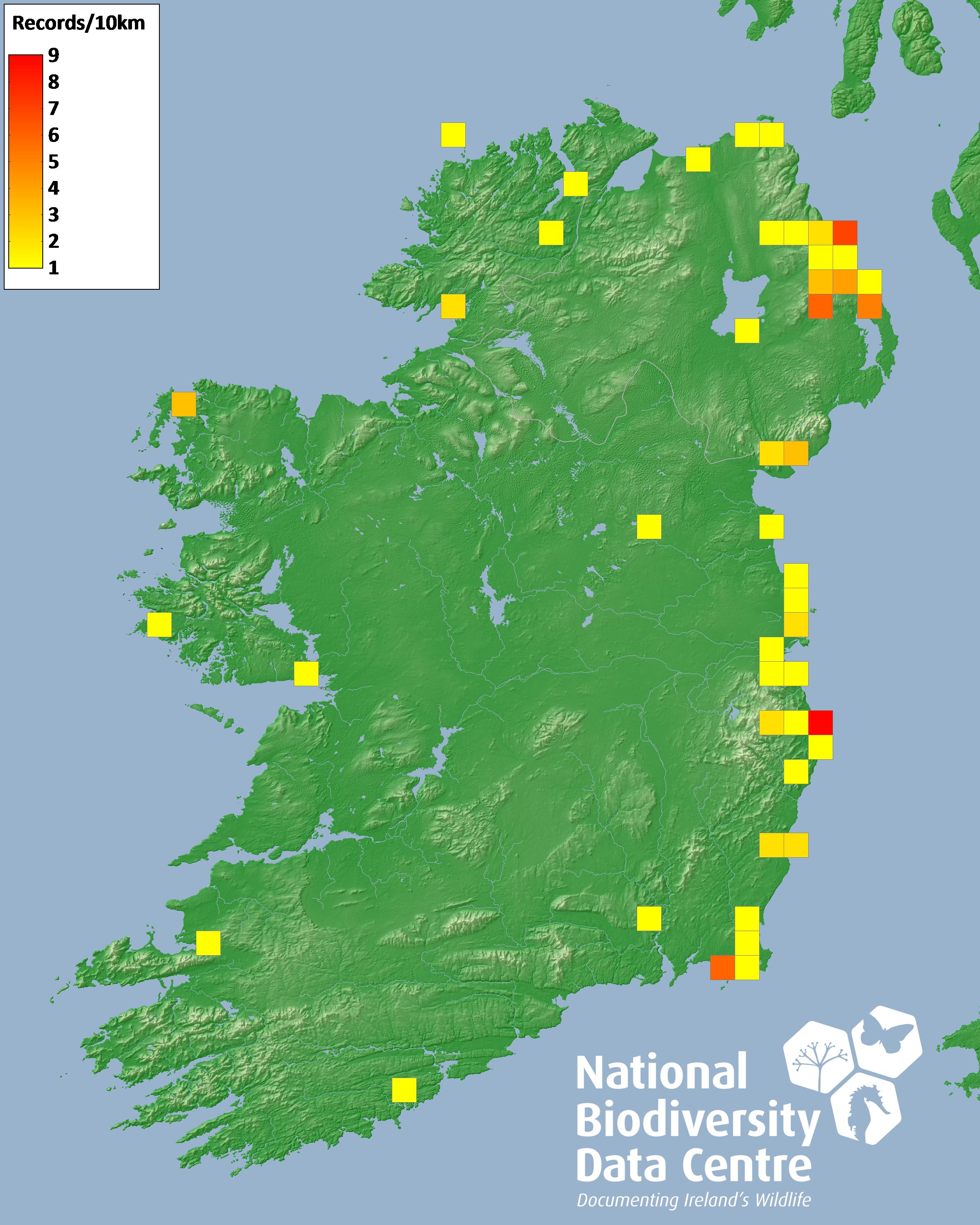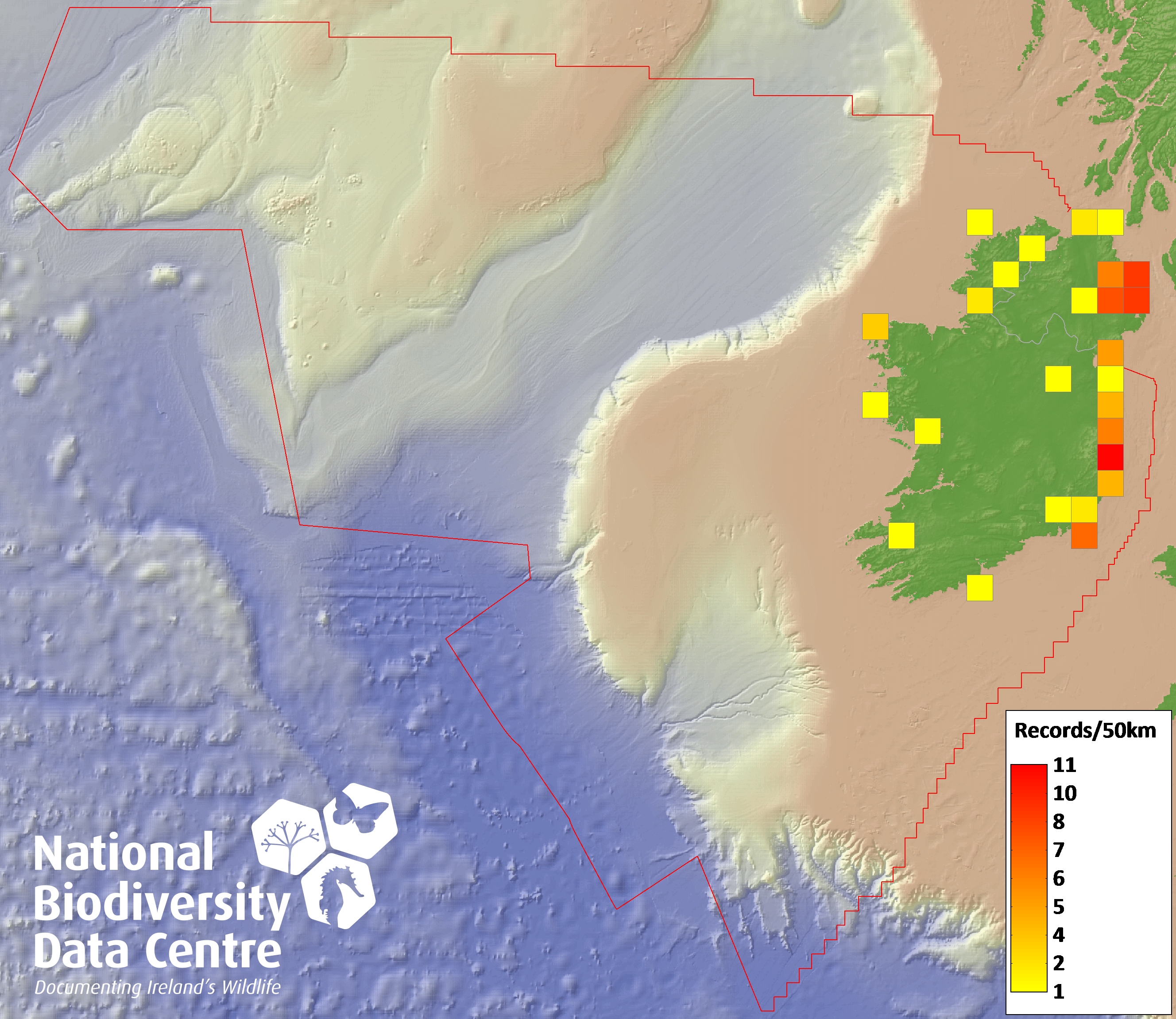 Distribution of the number of records recorded within each 10km grid square (ITM).Marine Map - 50km