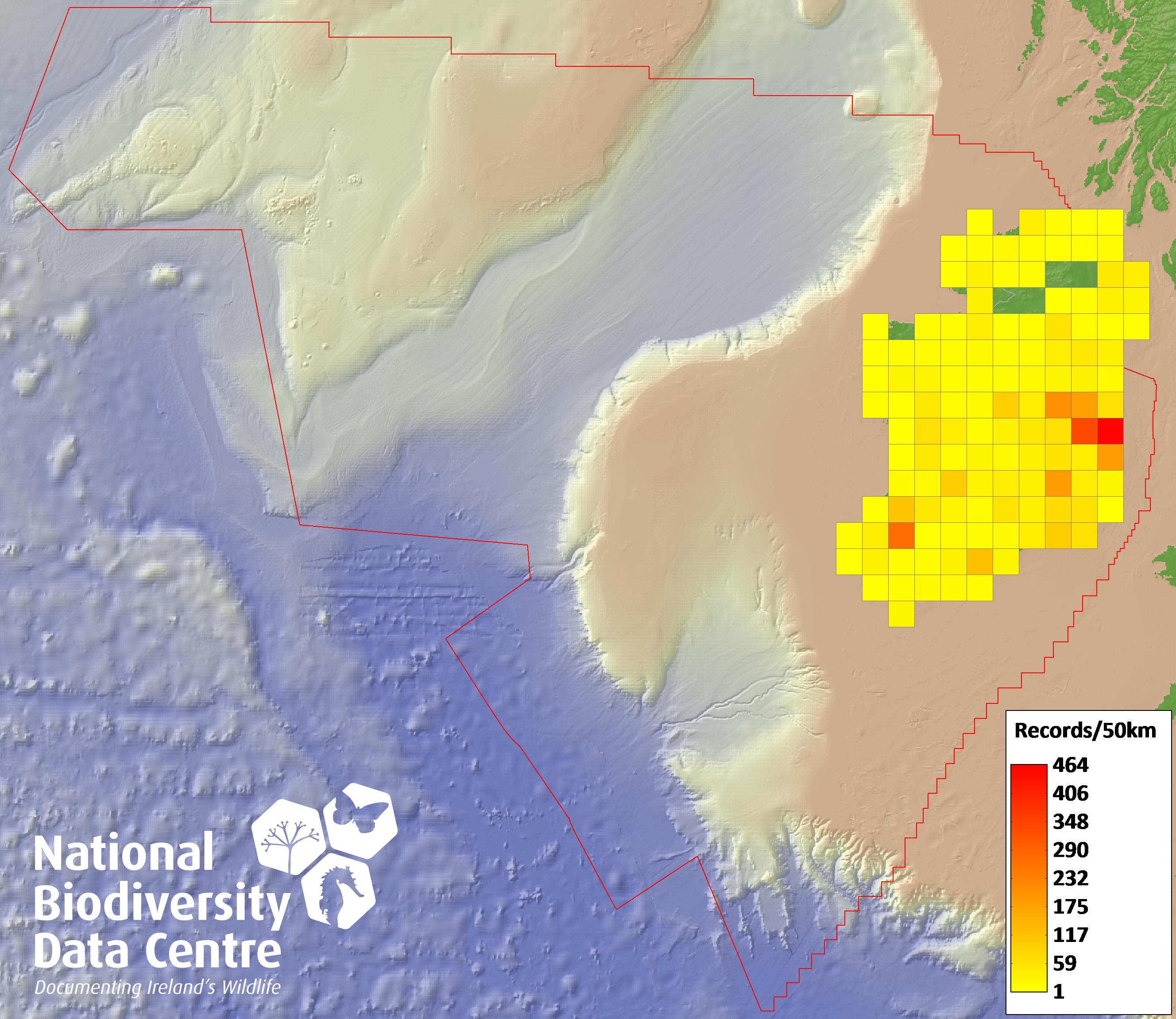 Distribution of the number of records recorded within each 10km grid square (ITM).Marine Map - 50km