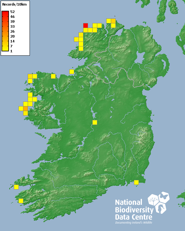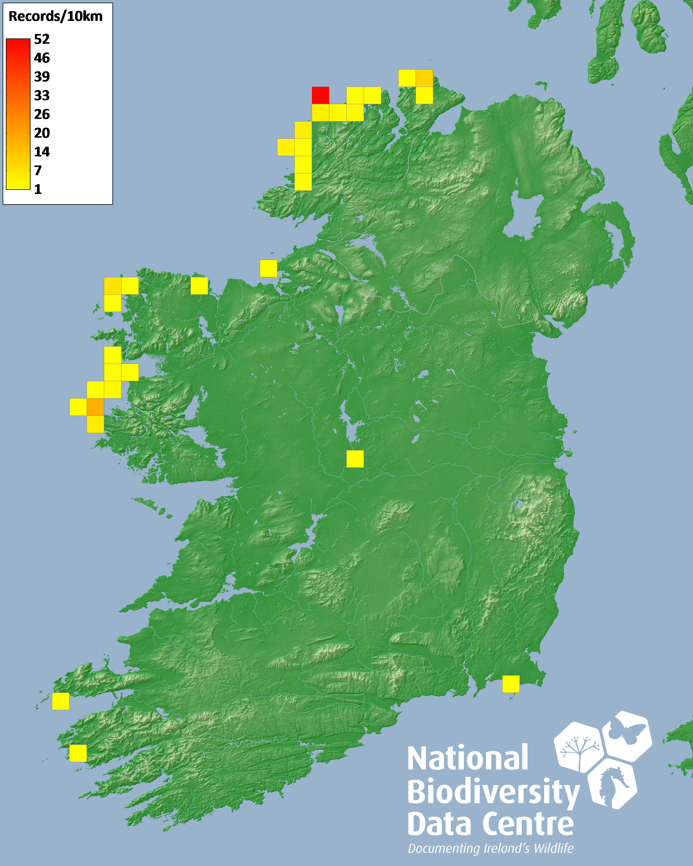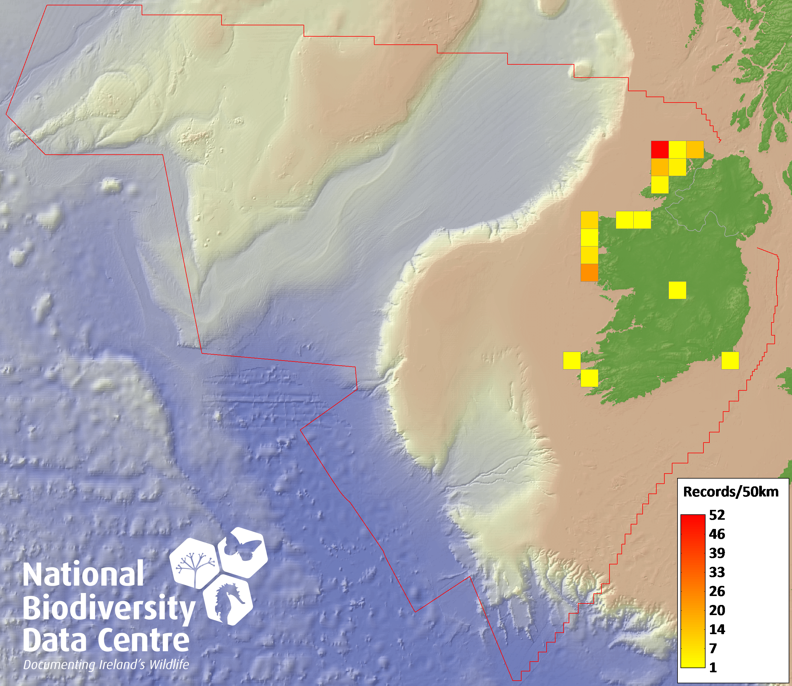 Distribution of the number of records recorded within each 10km grid square (ITM).Marine Map - 50km