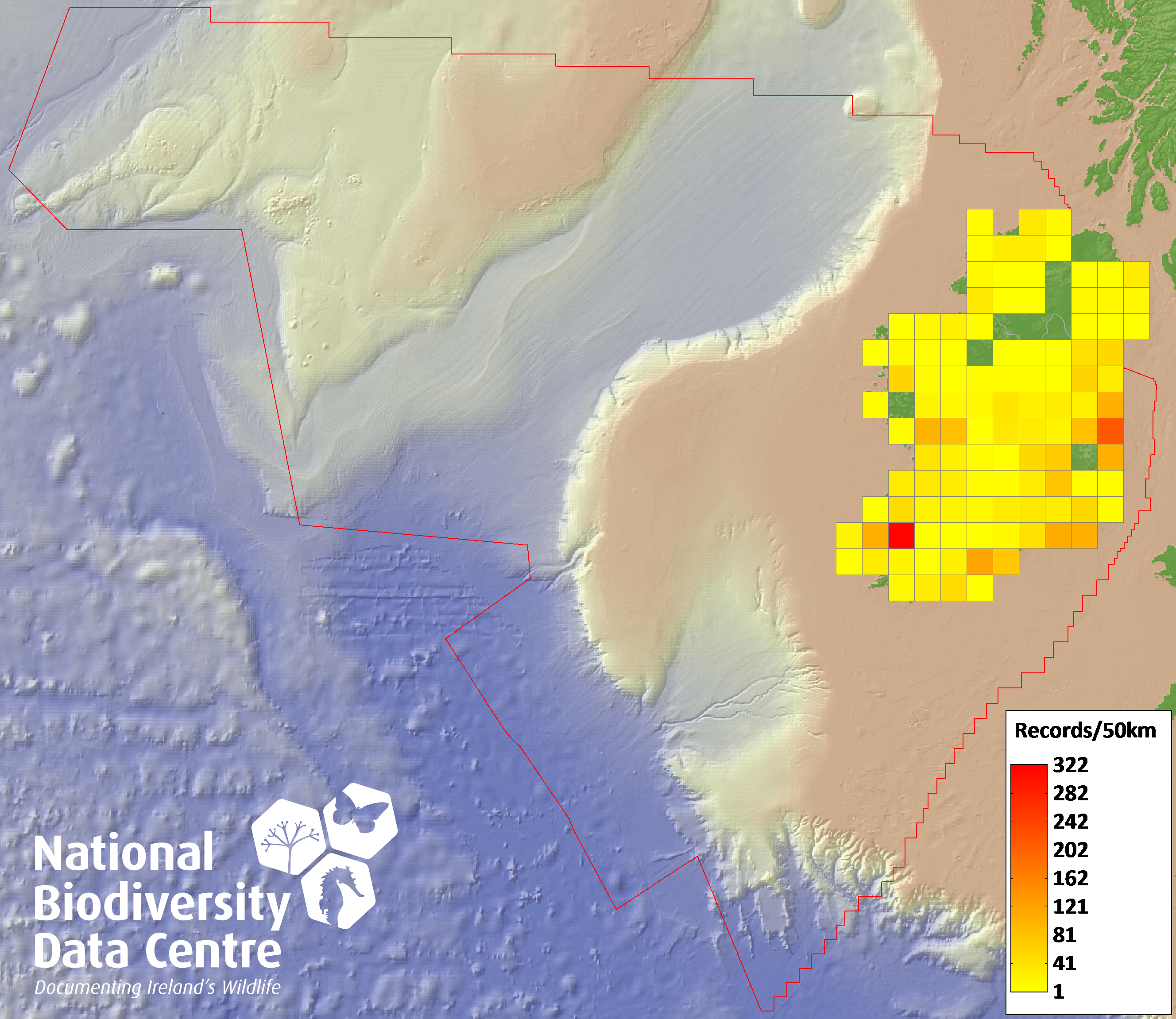 Distribution of the number of records recorded within each 10km grid square (ITM).Marine Map - 50km
