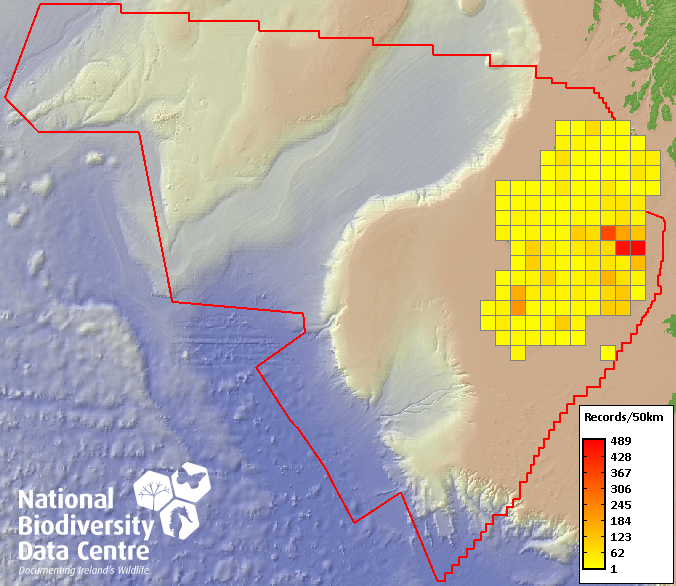 Distribution of the number of records recorded within each 10km grid square (ITM).Marine Map - 50km