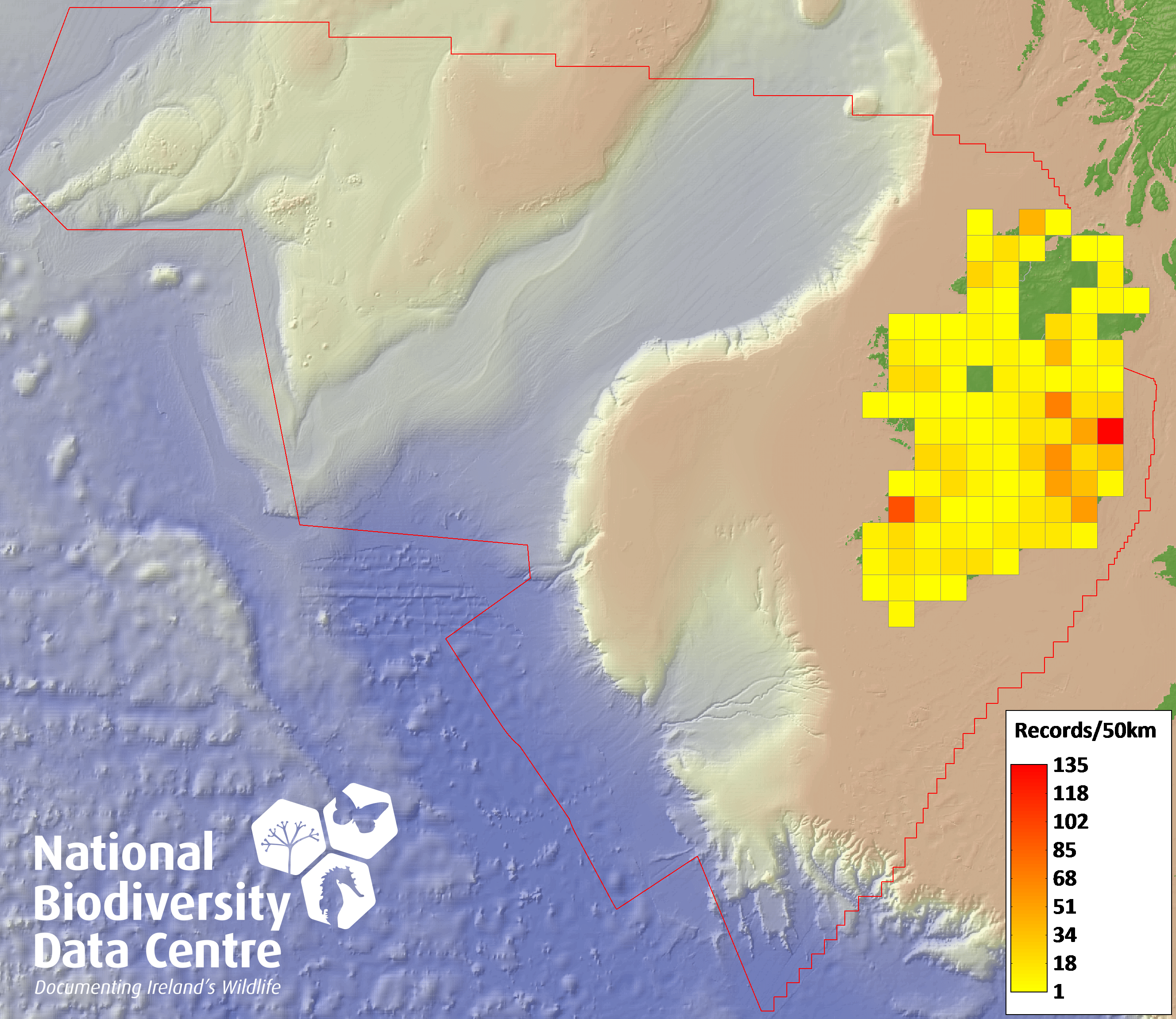 Distribution of the number of records recorded within each 10km grid square (ITM).Marine Map - 50km