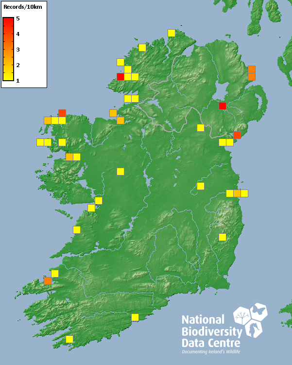 Distribution of the number of records recorded within each 10km grid square (ITM).Marine Map - 50km