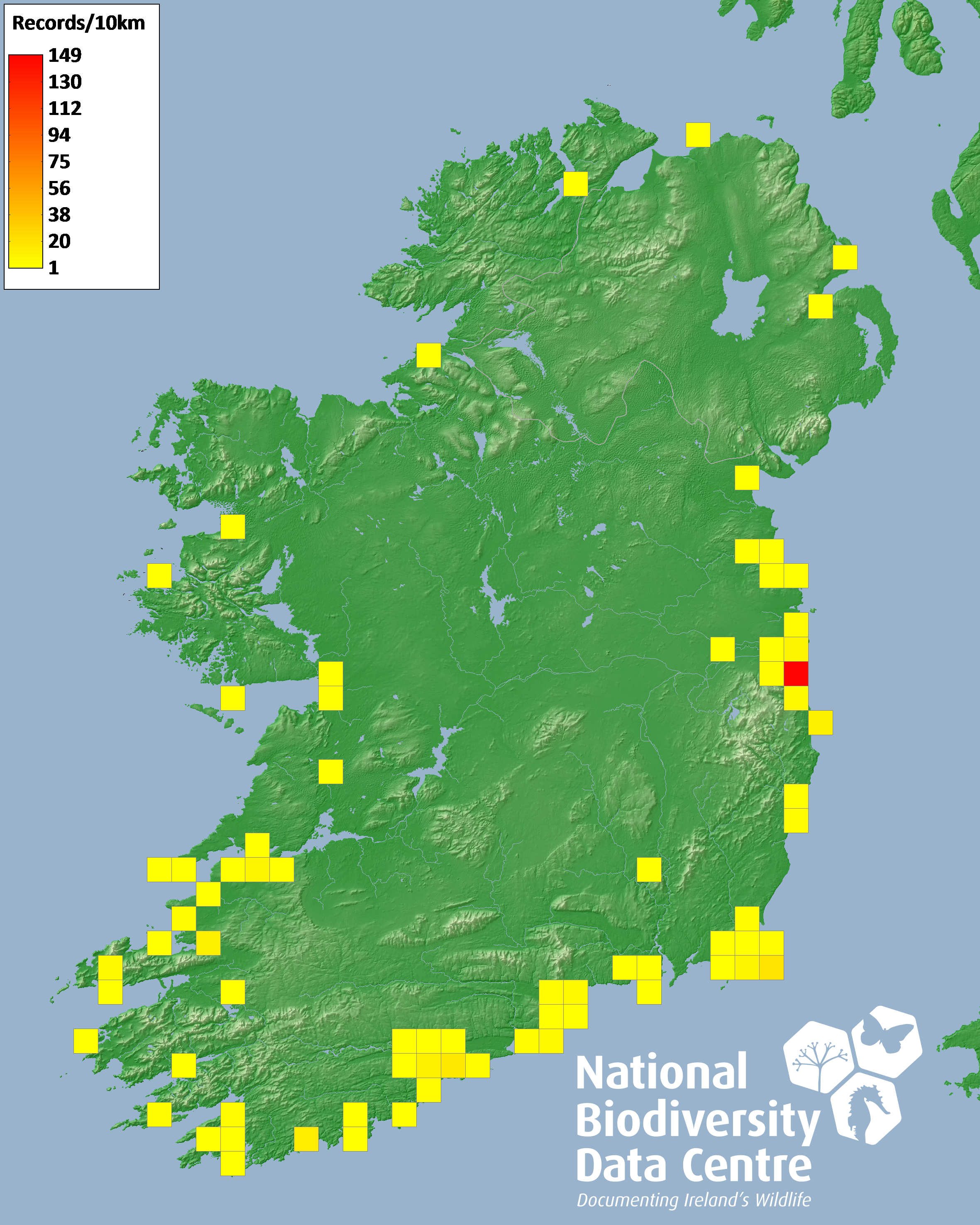Distribution of the number of records recorded within each 10km grid square (ITM).Marine Map - 50km