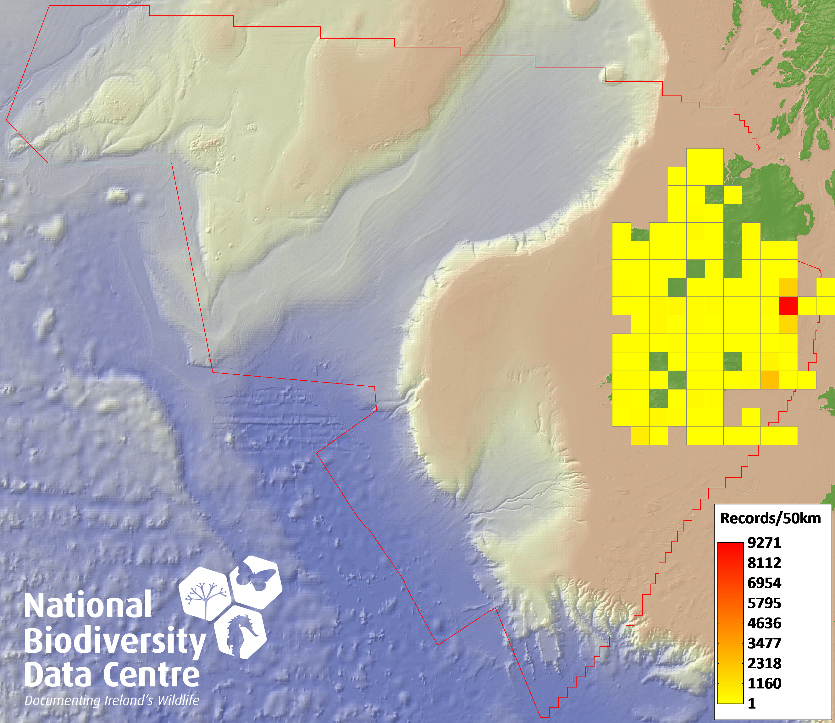 Distribution of the number of records within each 10km grid square (ITM).Marine Map - 50Km