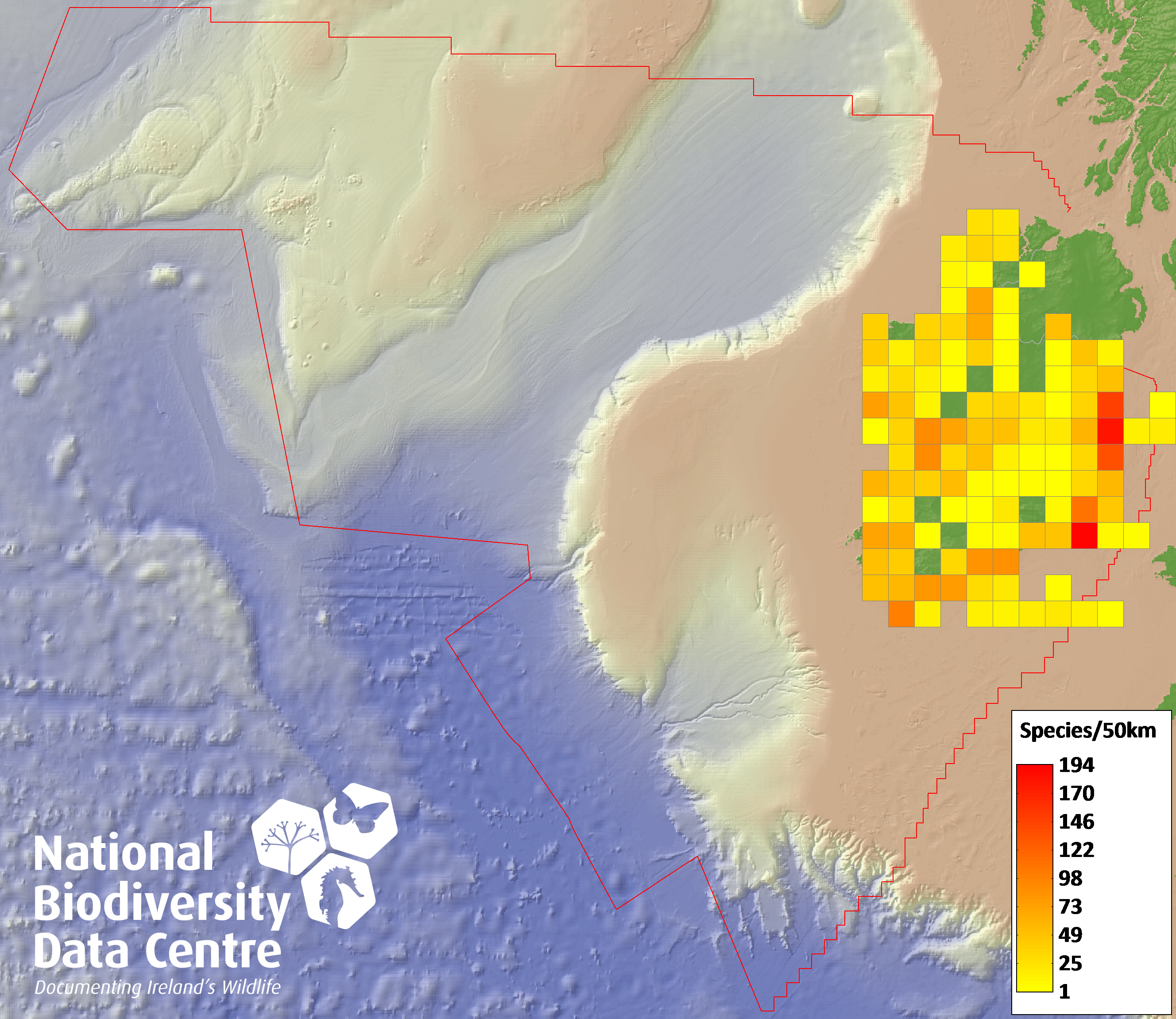 Distribution of the number of species recorded within each 10km grid square (ITM).Marine Map - 50Km