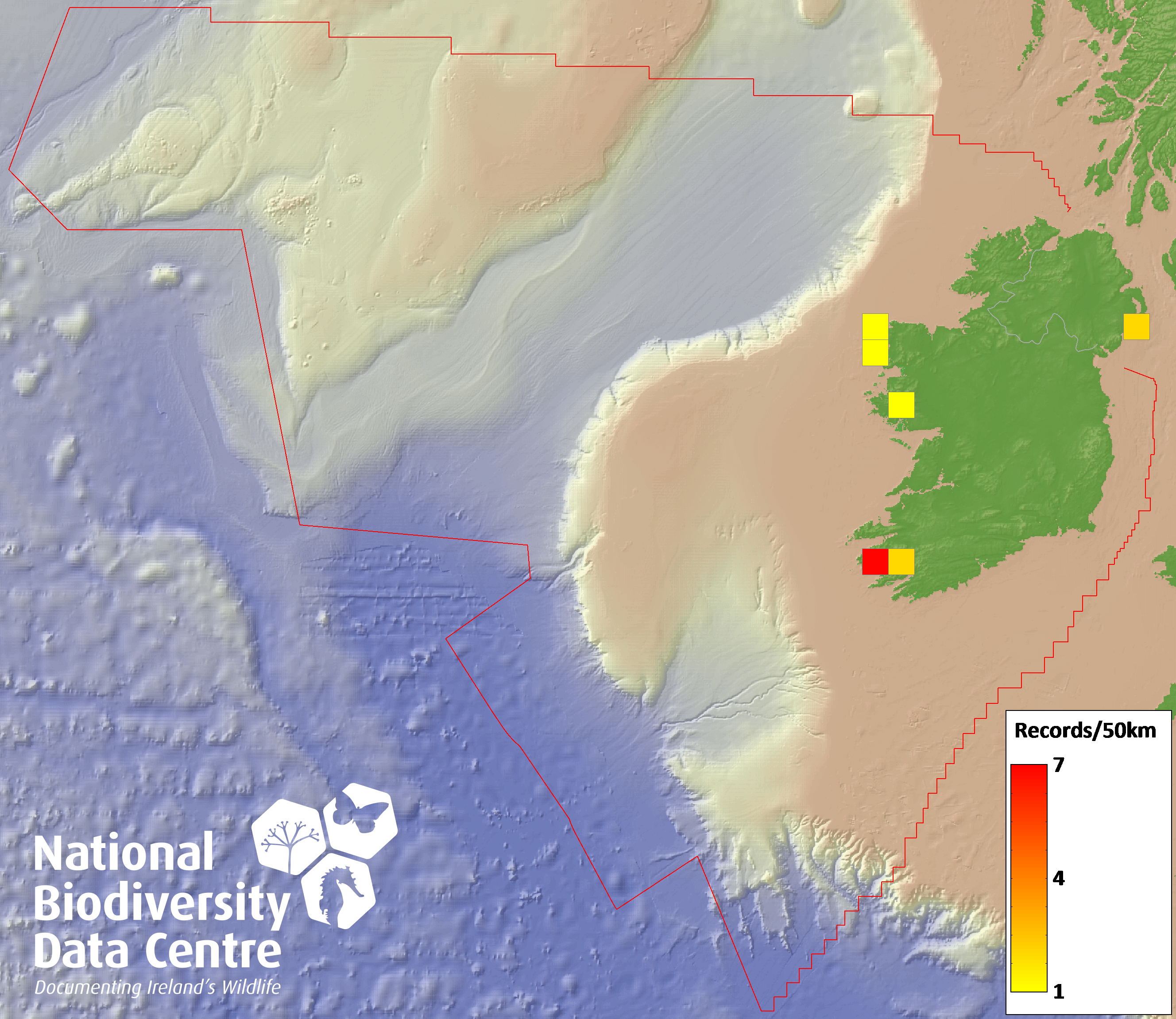Distribution of the number of records recorded within each 10km grid square (ITM).Marine Map - 50km