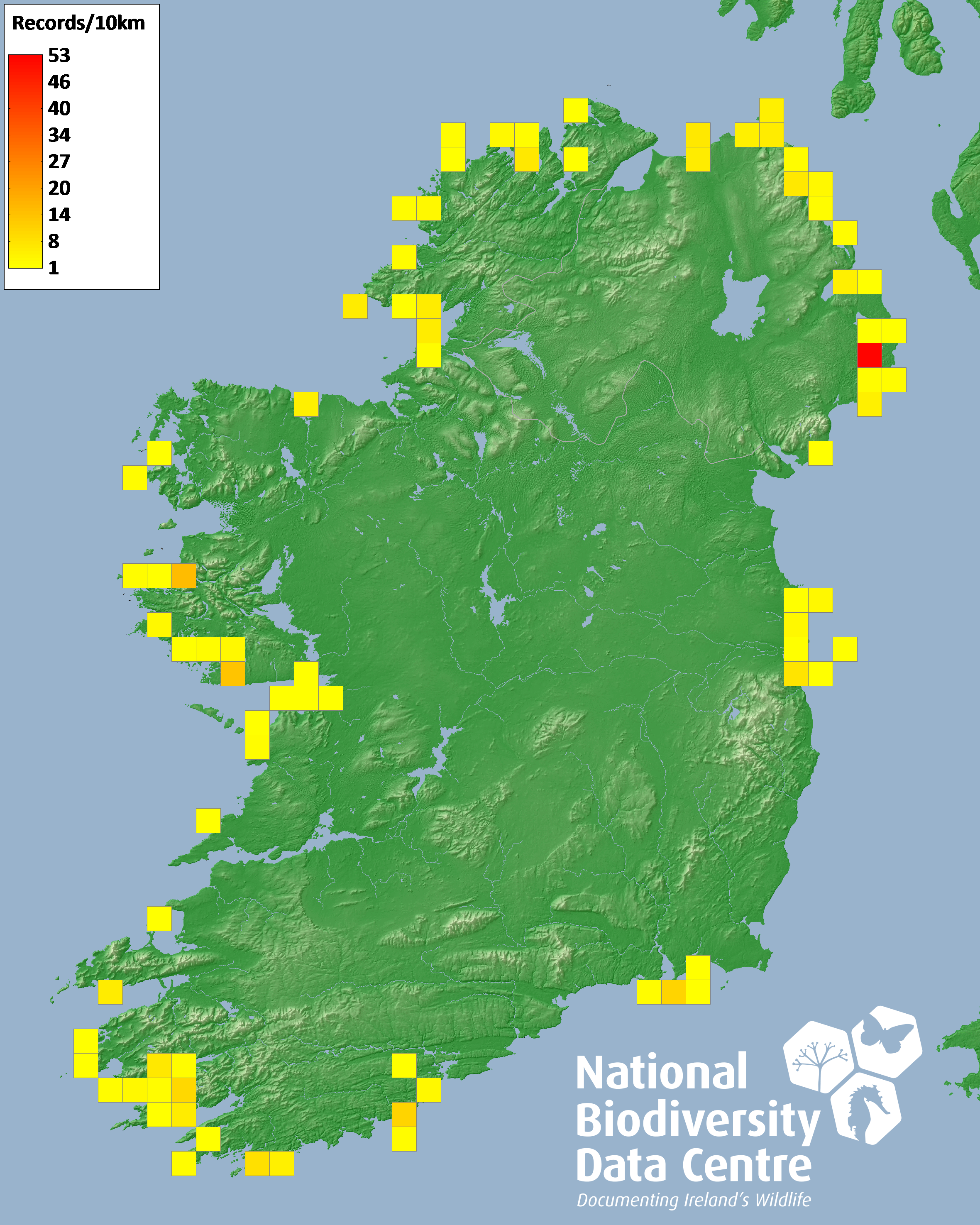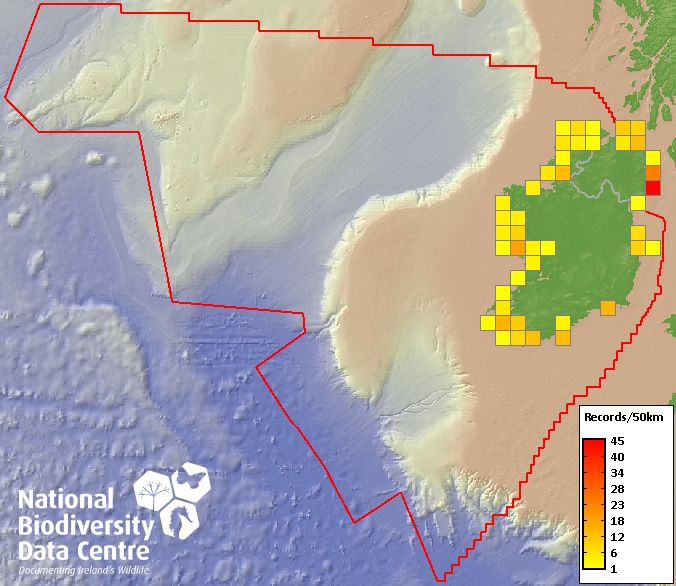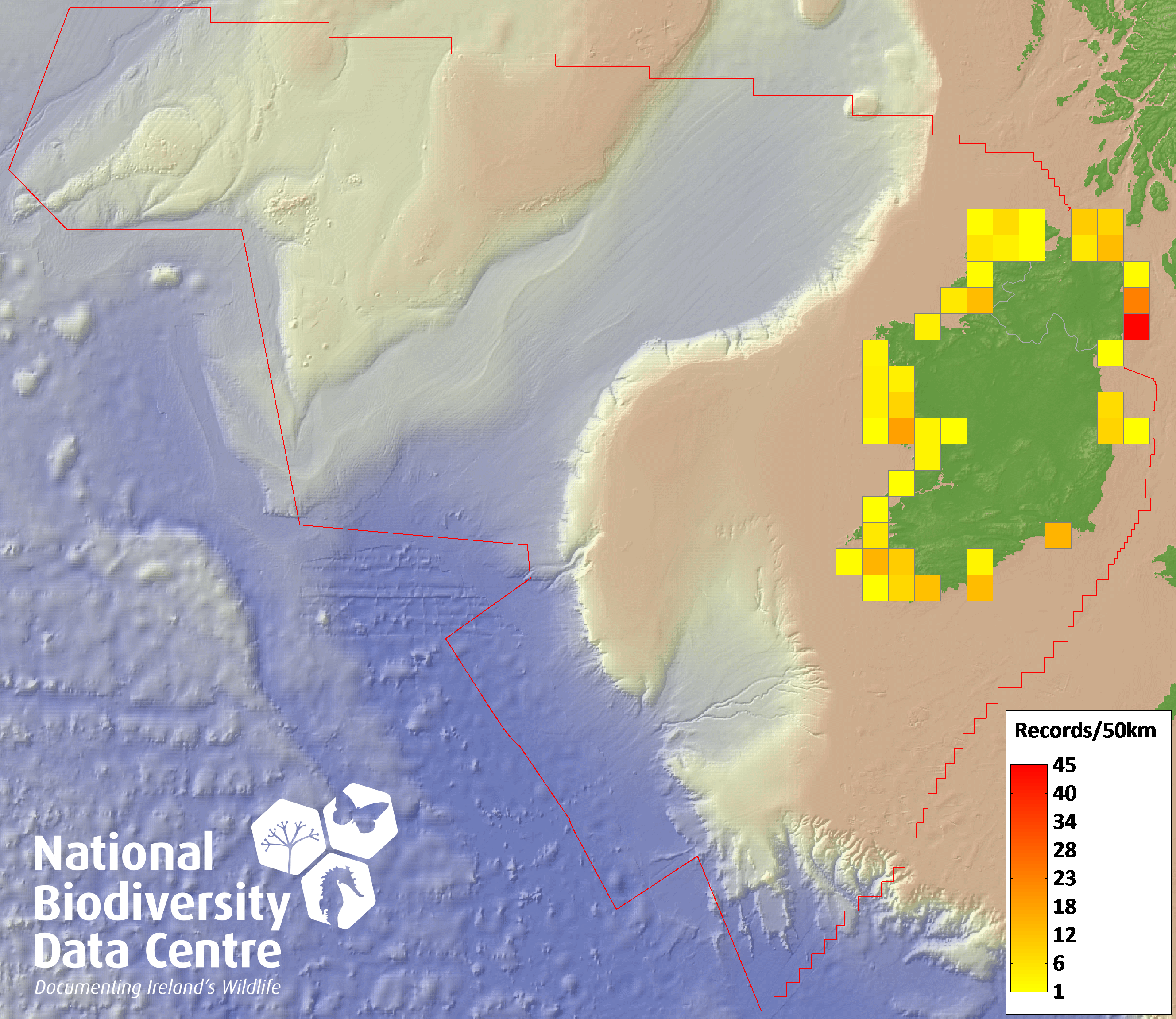 Distribution of the number of records recorded within each 10km grid square (ITM).Marine Map - 50km