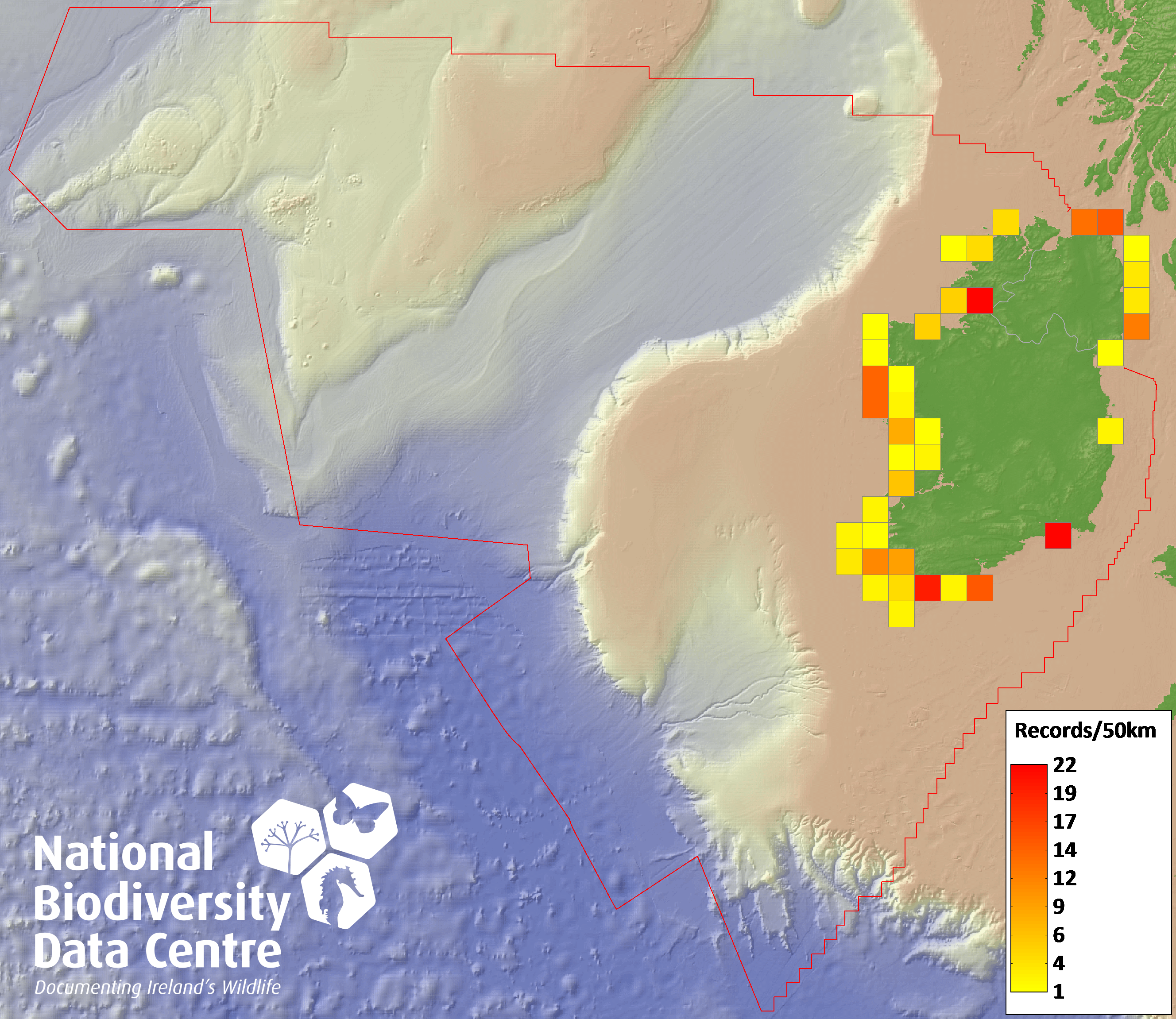 Distribution of the number of records recorded within each 10km grid square (ITM).Marine Map - 50km