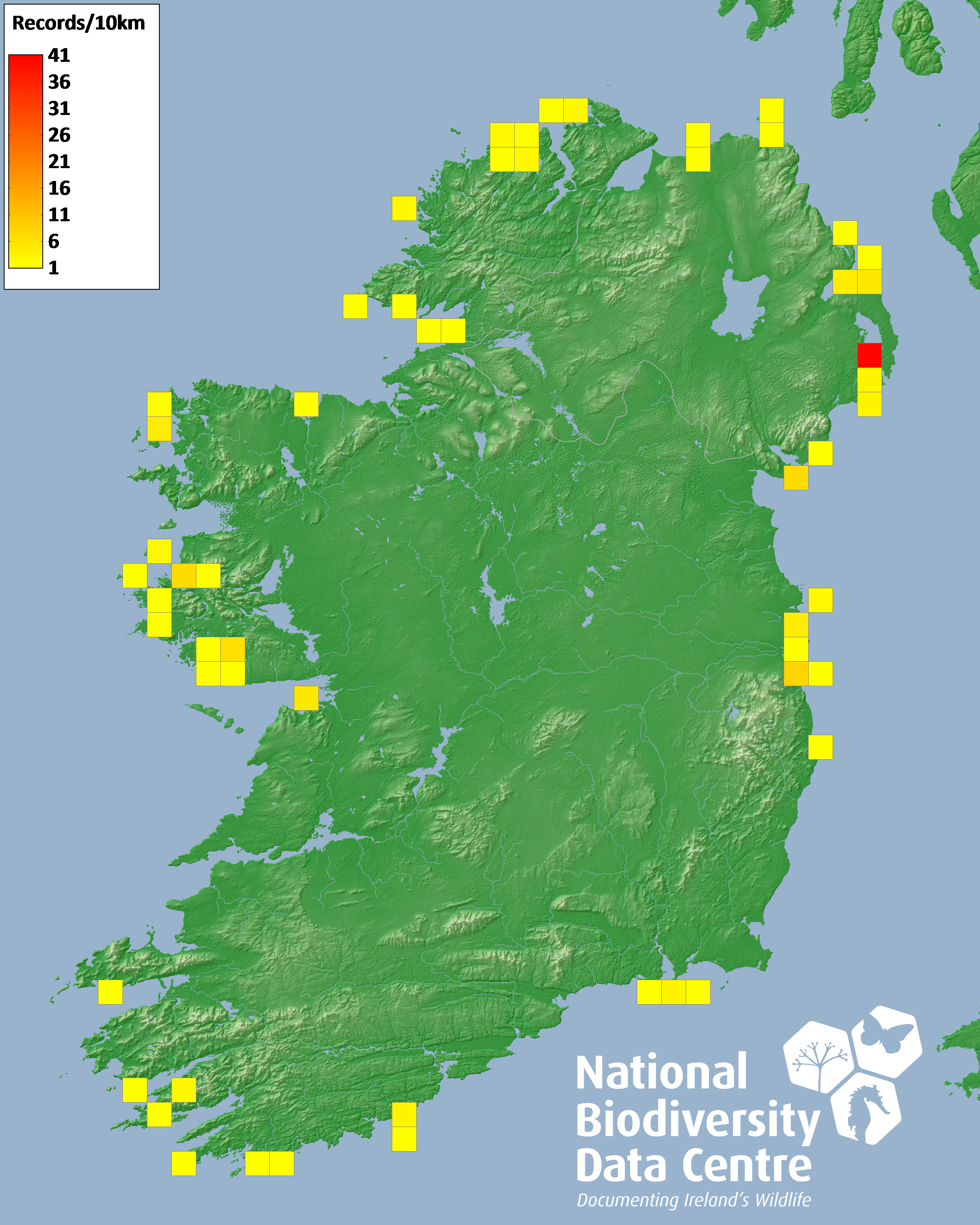 Distribution of the number of records recorded within each 10km grid square (ITM).Marine Map - 50km