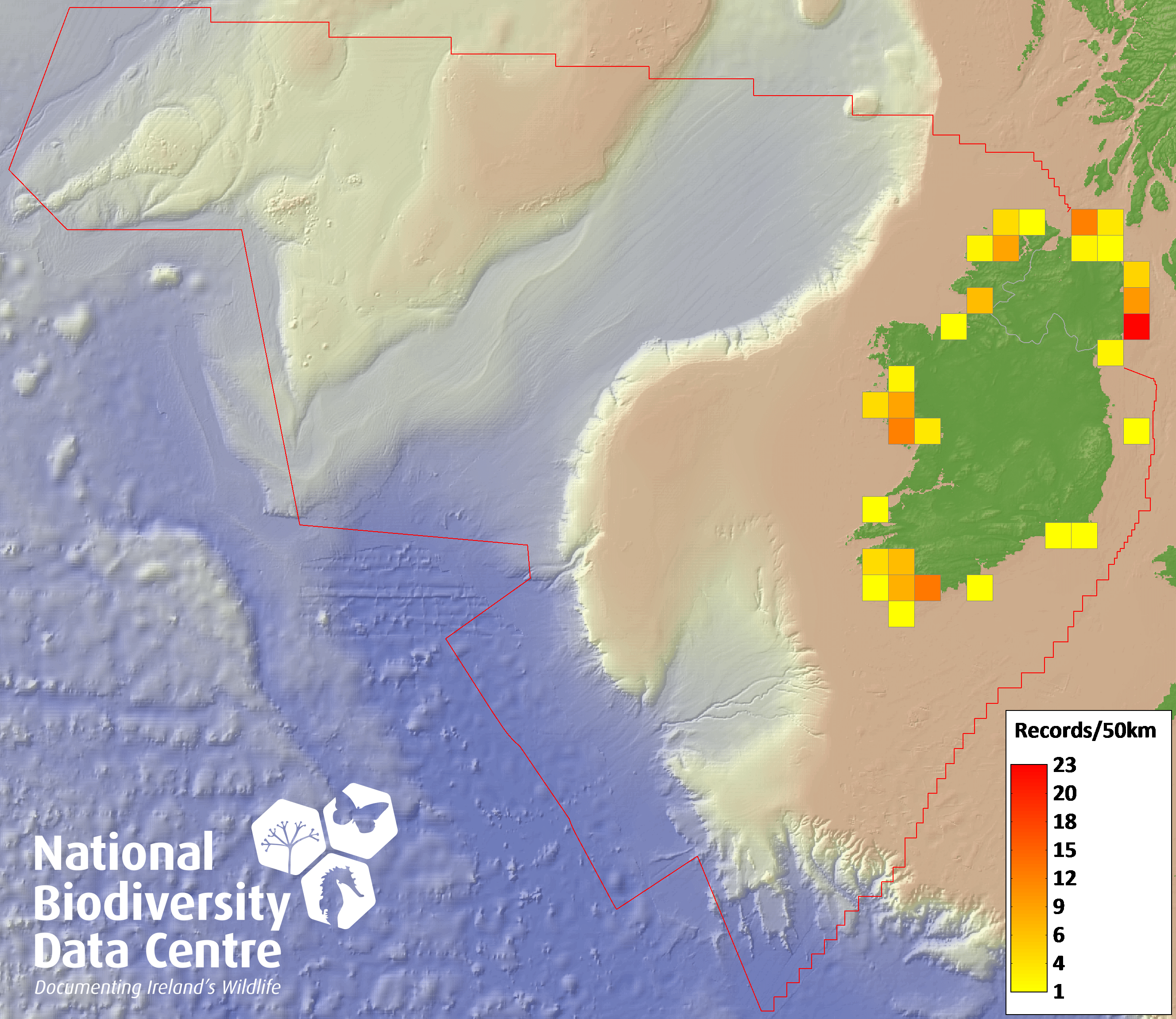 Distribution of the number of records recorded within each 10km grid square (ITM).Marine Map - 50km