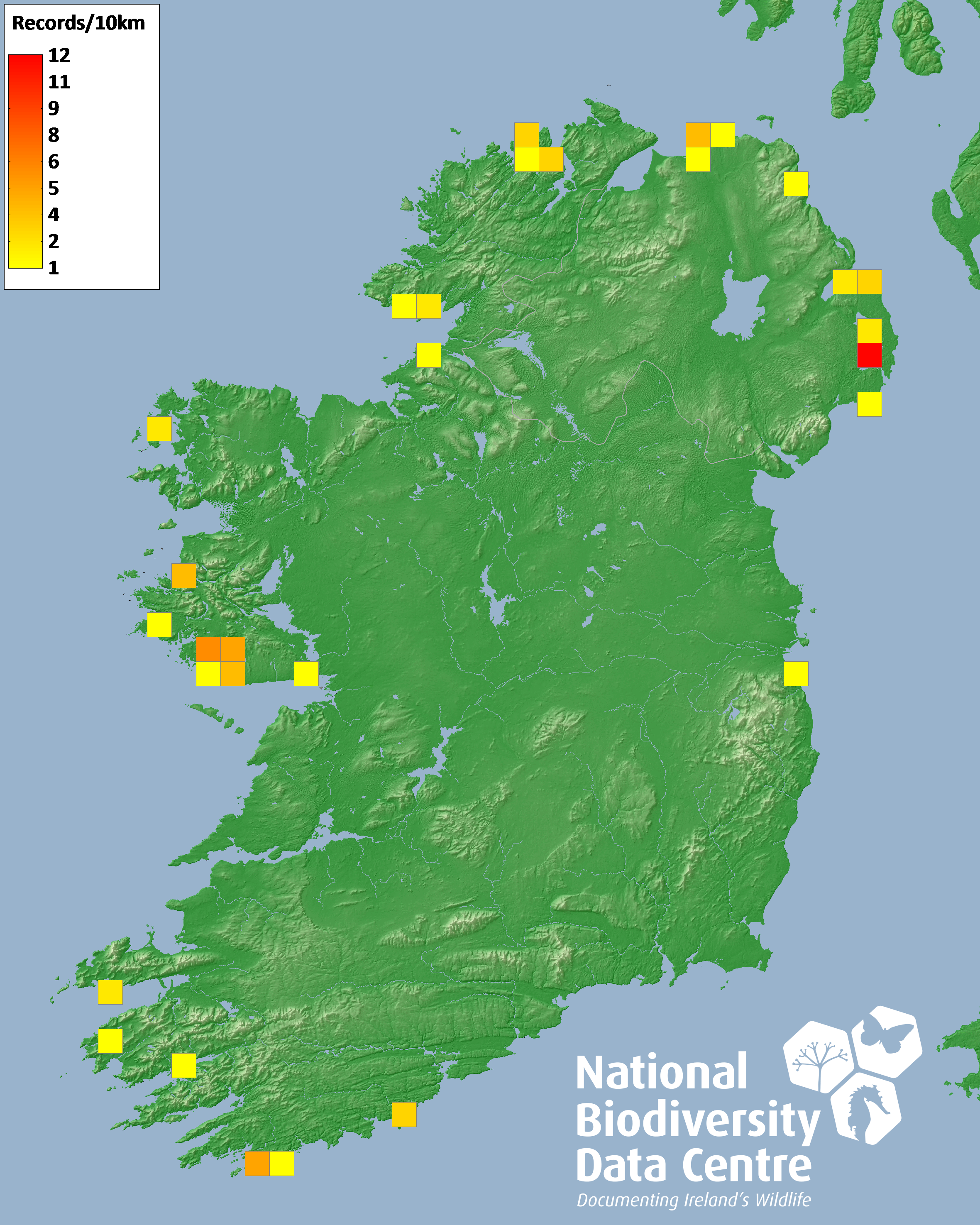 Distribution of the number of records recorded within each 10km grid square (ITM).Marine Map - 50km