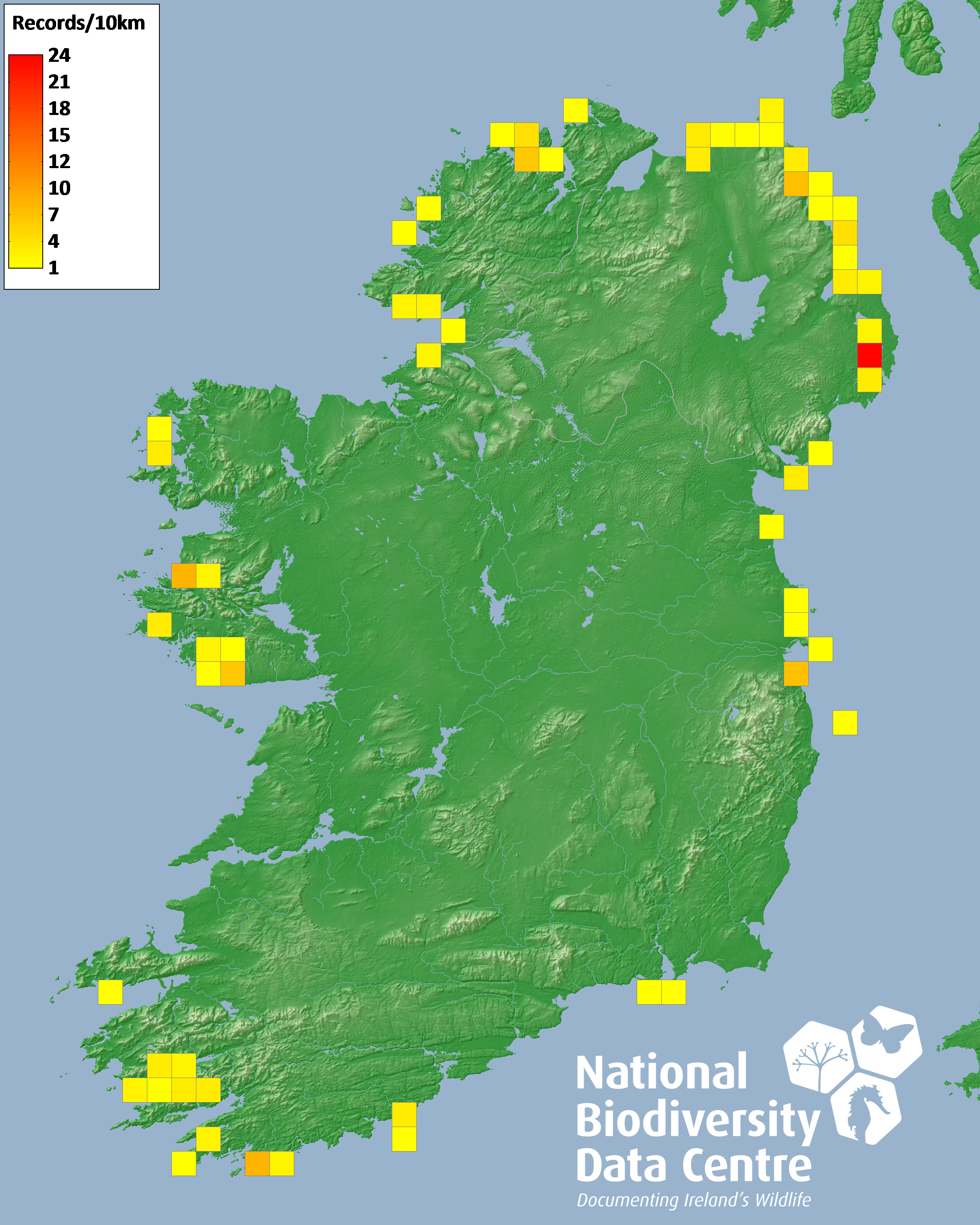 Distribution of the number of records recorded within each 10km grid square (ITM).Marine Map - 50km