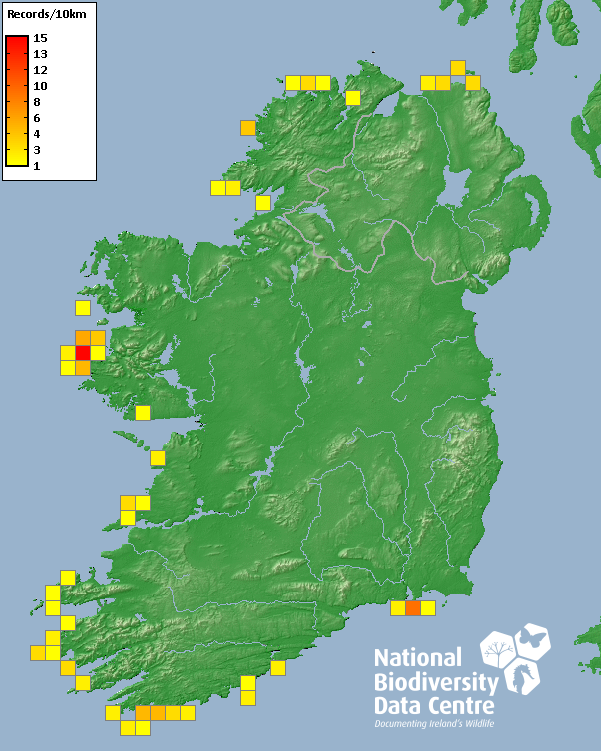 Distribution of the number of records recorded within each 10km grid square (ITM).Marine Map - 50km