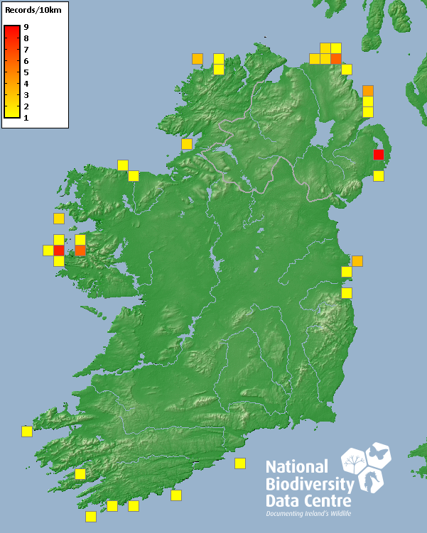 Distribution of the number of records recorded within each 10km grid square (ITM).Marine Map - 50km