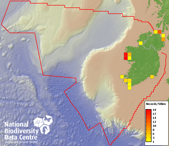Distribution of the number of records recorded within each 10km grid square (ITM).Marine Map - 50km