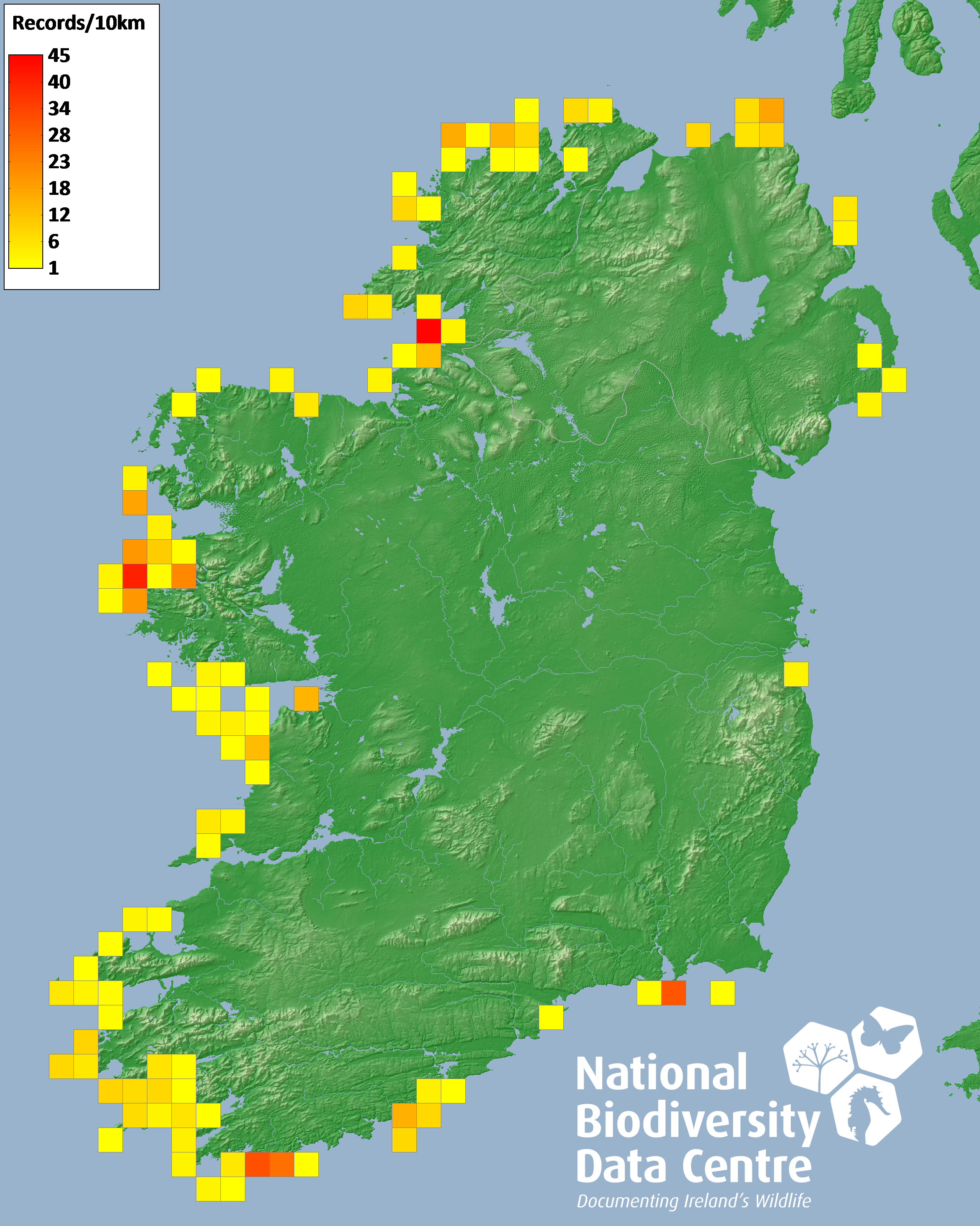 Distribution of the number of records recorded within each 10km grid square (ITM).Marine Map - 50km