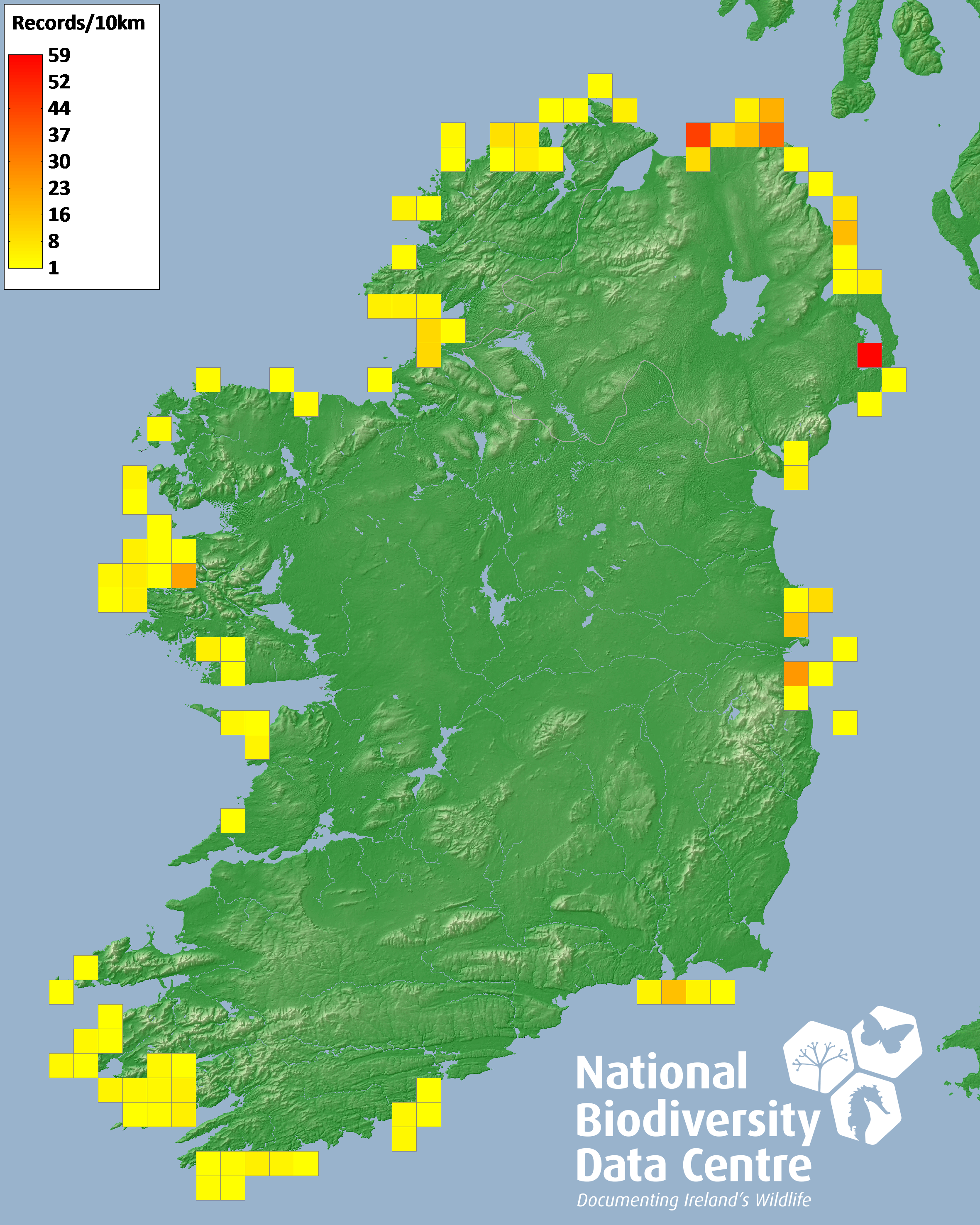 Distribution of the number of records recorded within each 10km grid square (ITM).Marine Map - 50km