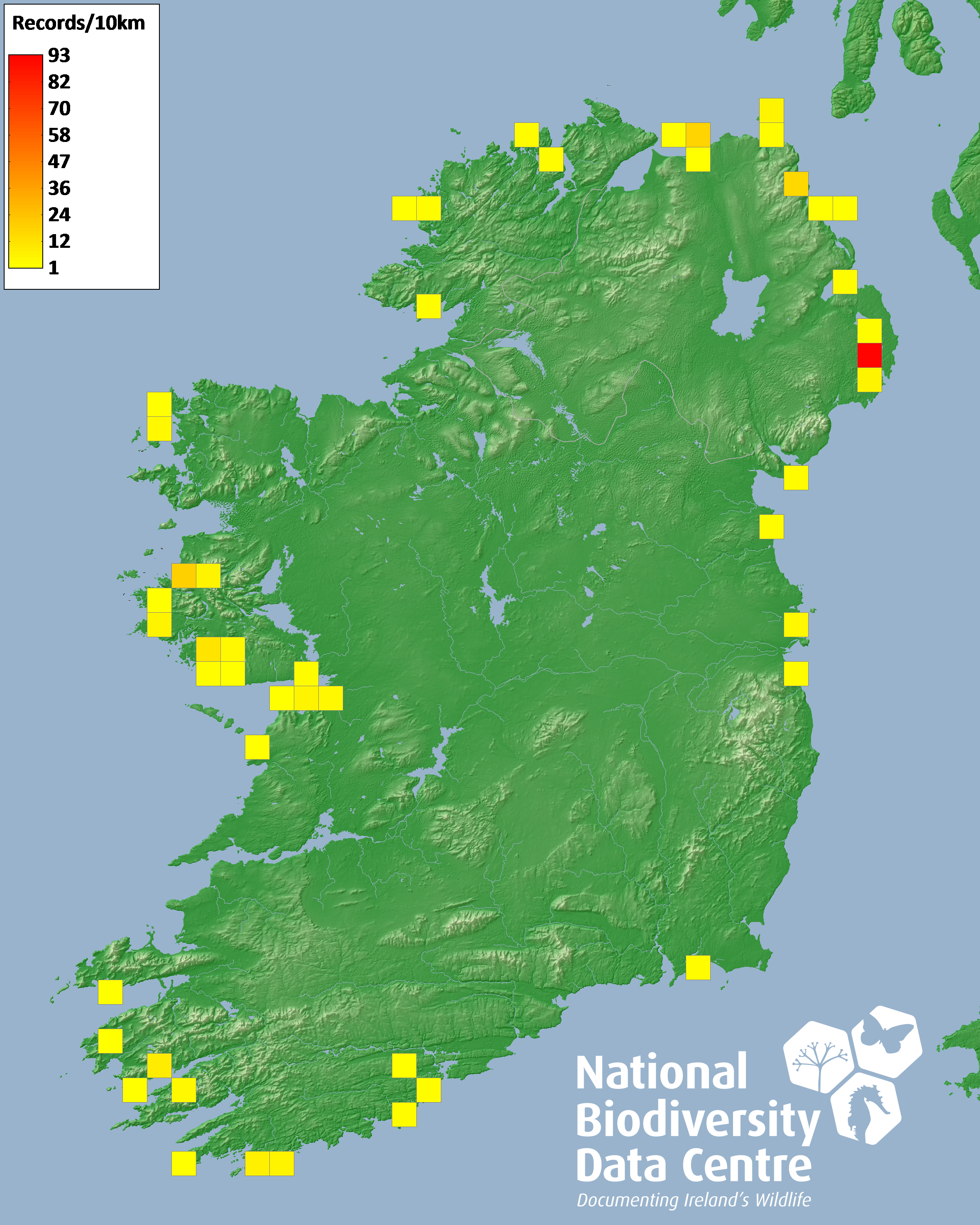 Distribution of the number of records recorded within each 10km grid square (ITM).Marine Map - 50km