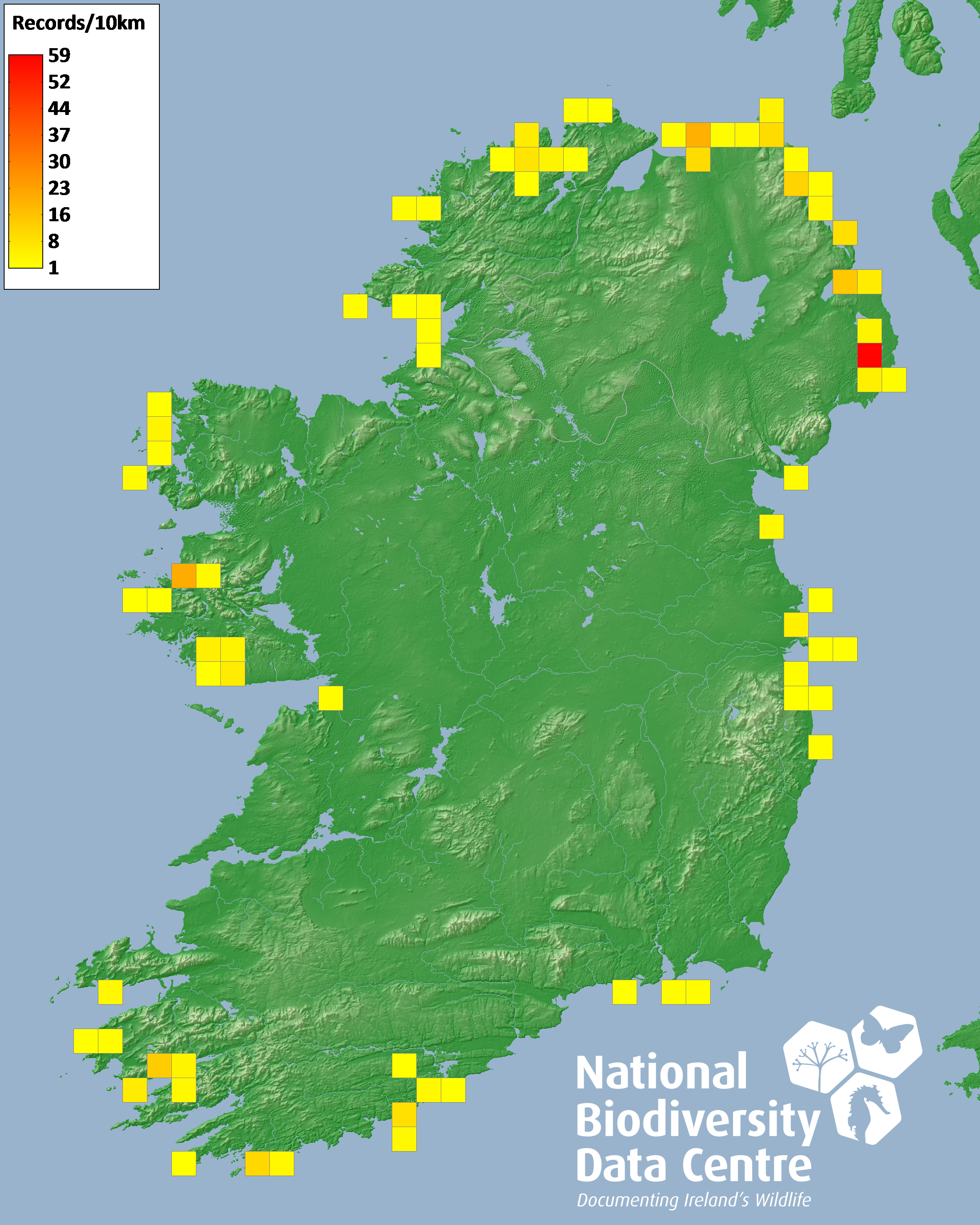 Distribution of the number of records recorded within each 10km grid square (ITM).Marine Map - 50km
