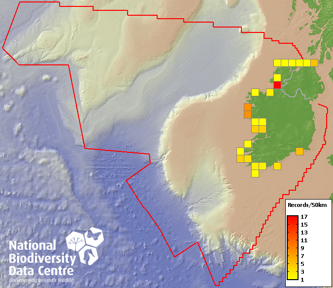 Distribution of the number of records recorded within each 10km grid square (ITM).Marine Map - 50km