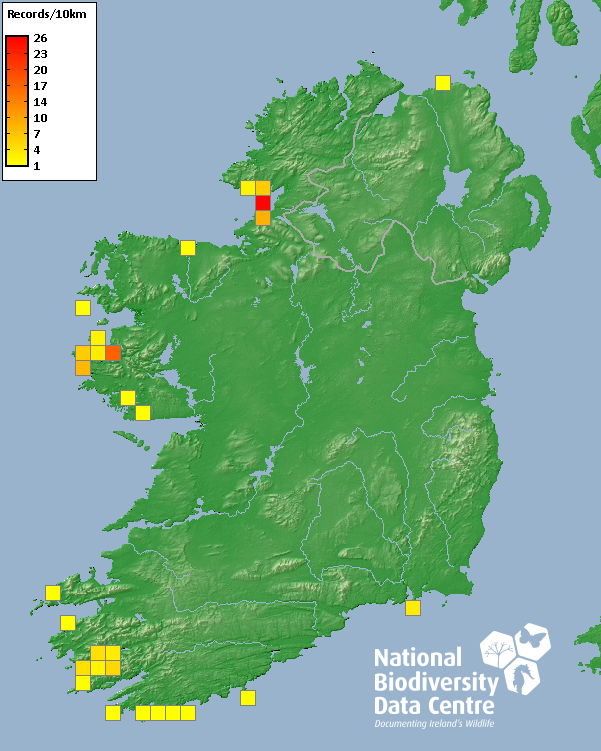 Distribution of the number of records recorded within each 10km grid square (ITM).Marine Map - 50km