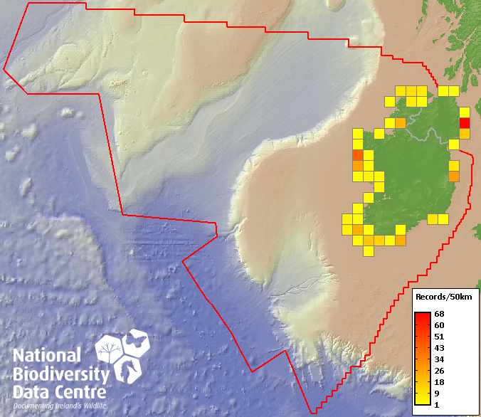 Distribution of the number of records recorded within each 10km grid square (ITM).Marine Map - 50km