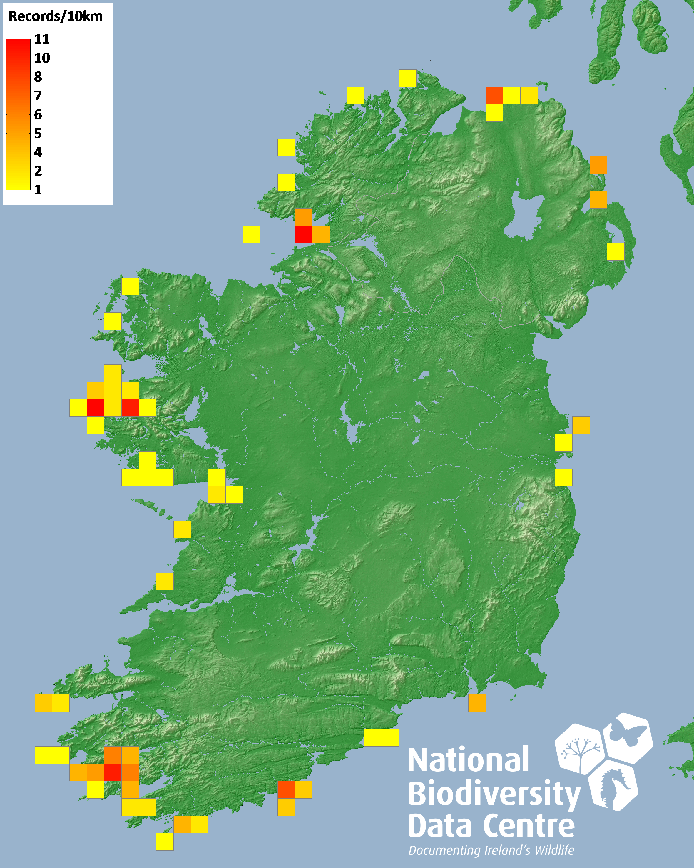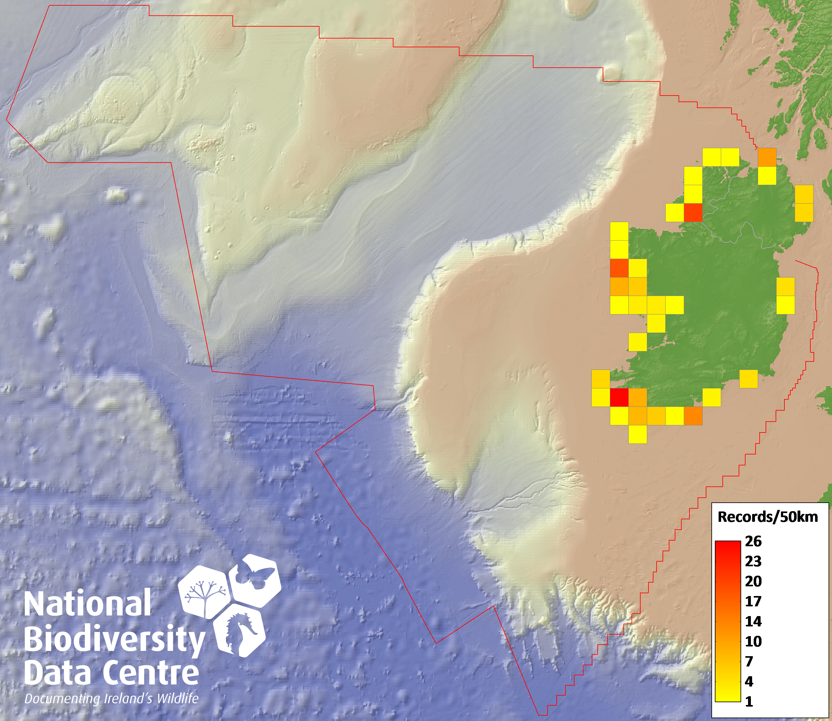 Distribution of the number of records recorded within each 10km grid square (ITM).Marine Map - 50km