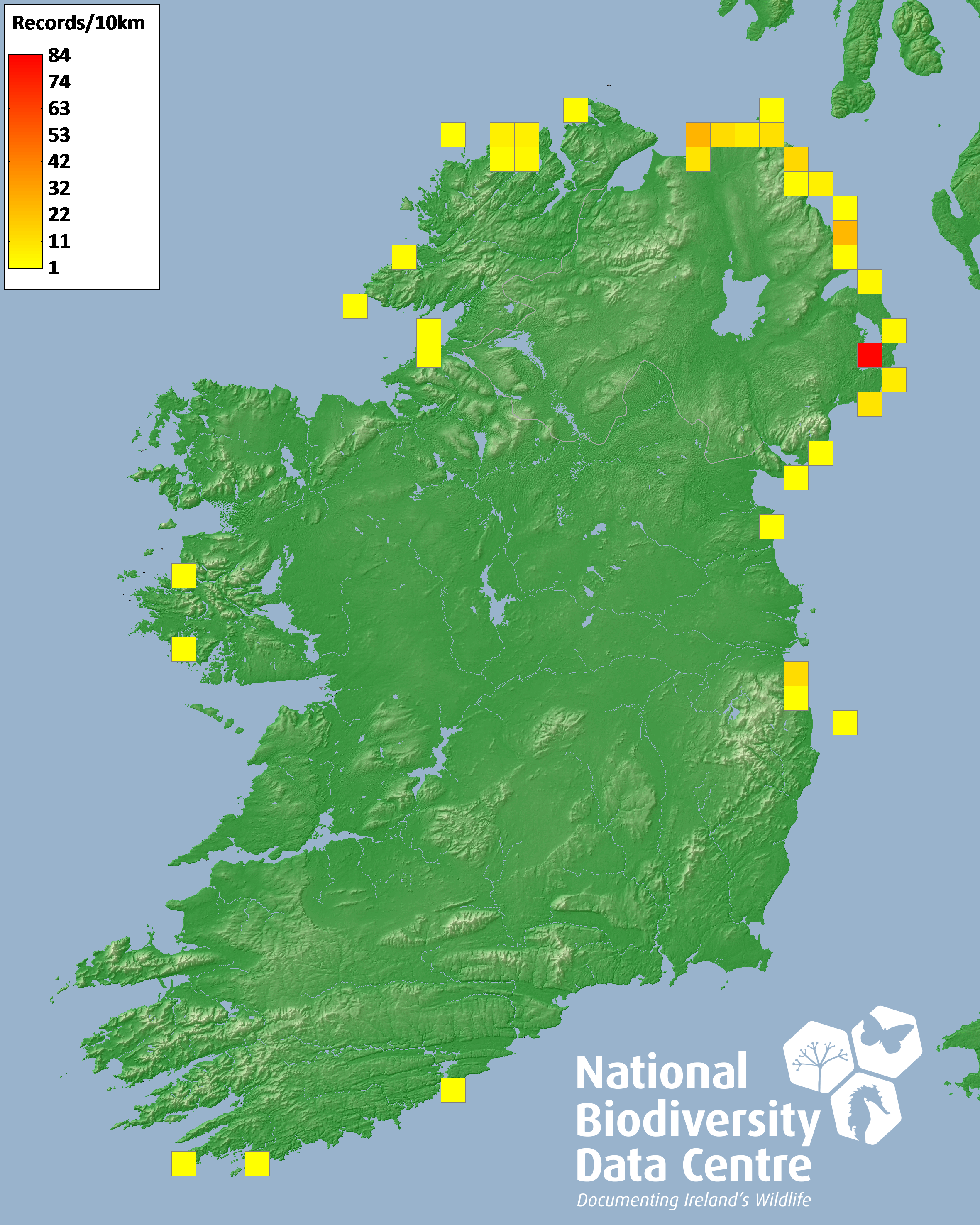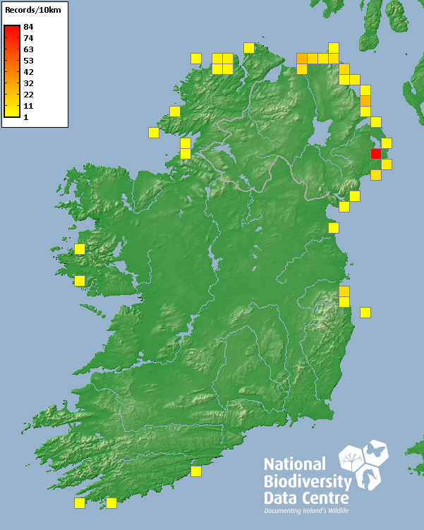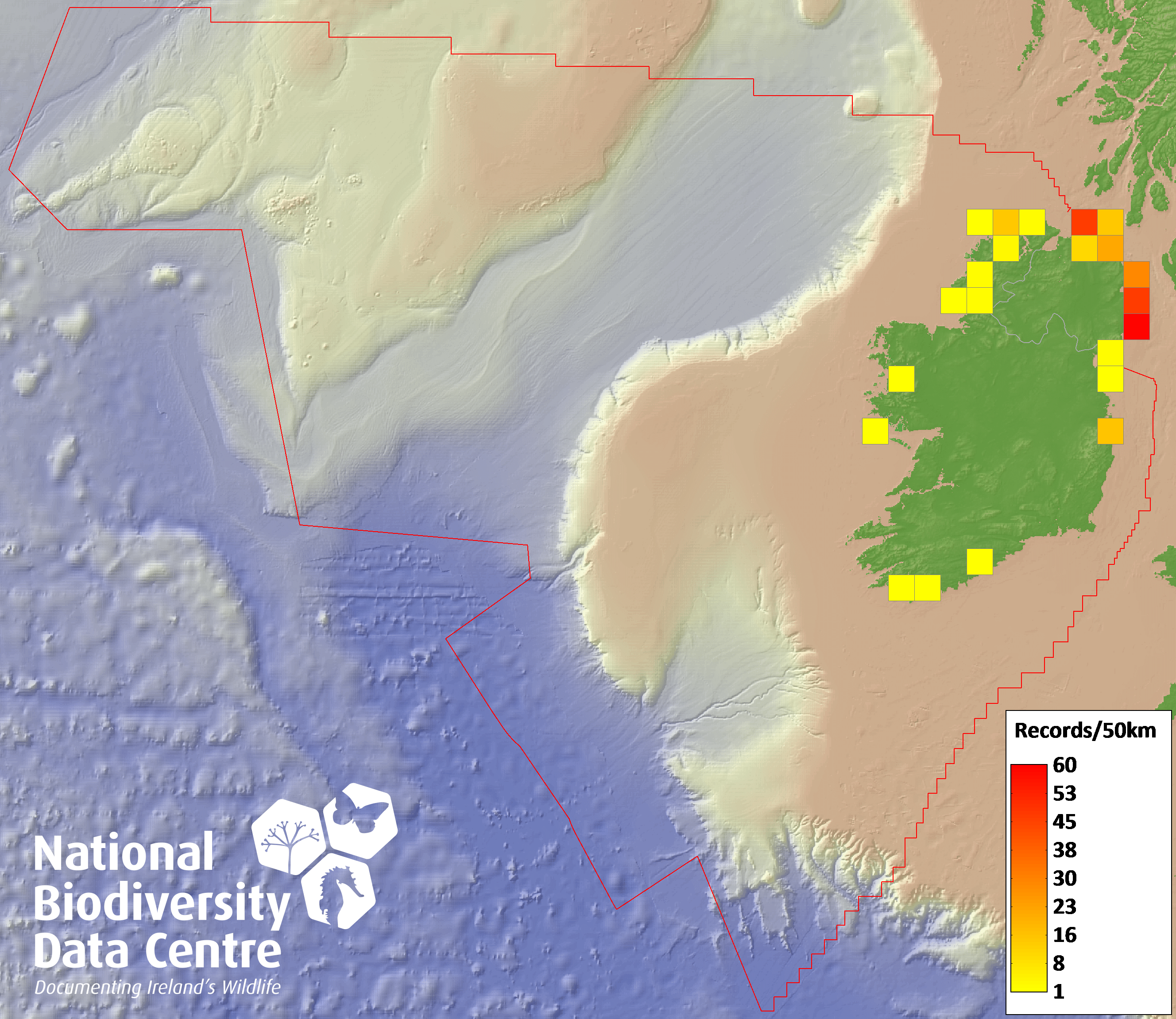 Distribution of the number of records recorded within each 10km grid square (ITM).Marine Map - 50km