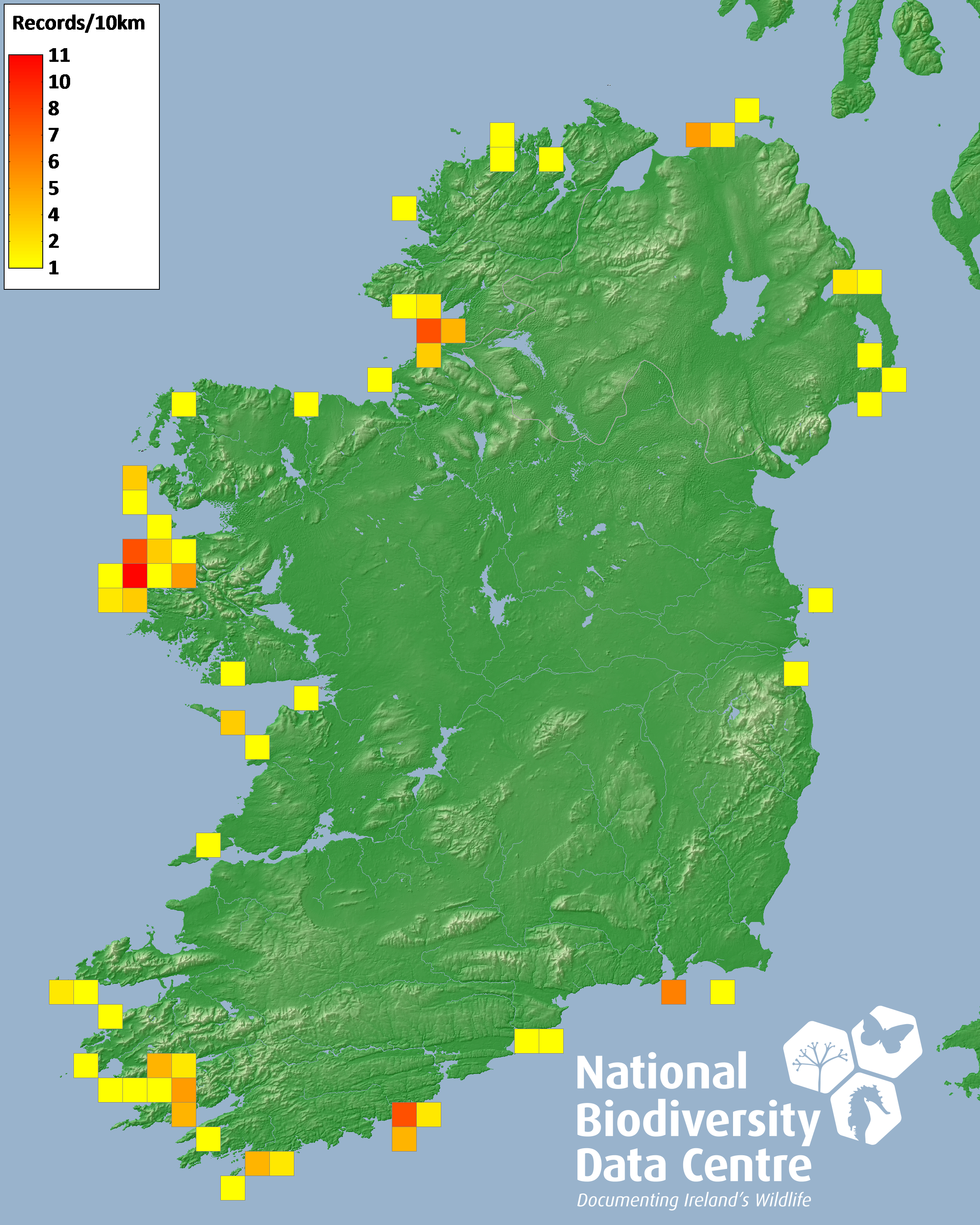 Distribution of the number of records recorded within each 10km grid square (ITM).Marine Map - 50km
