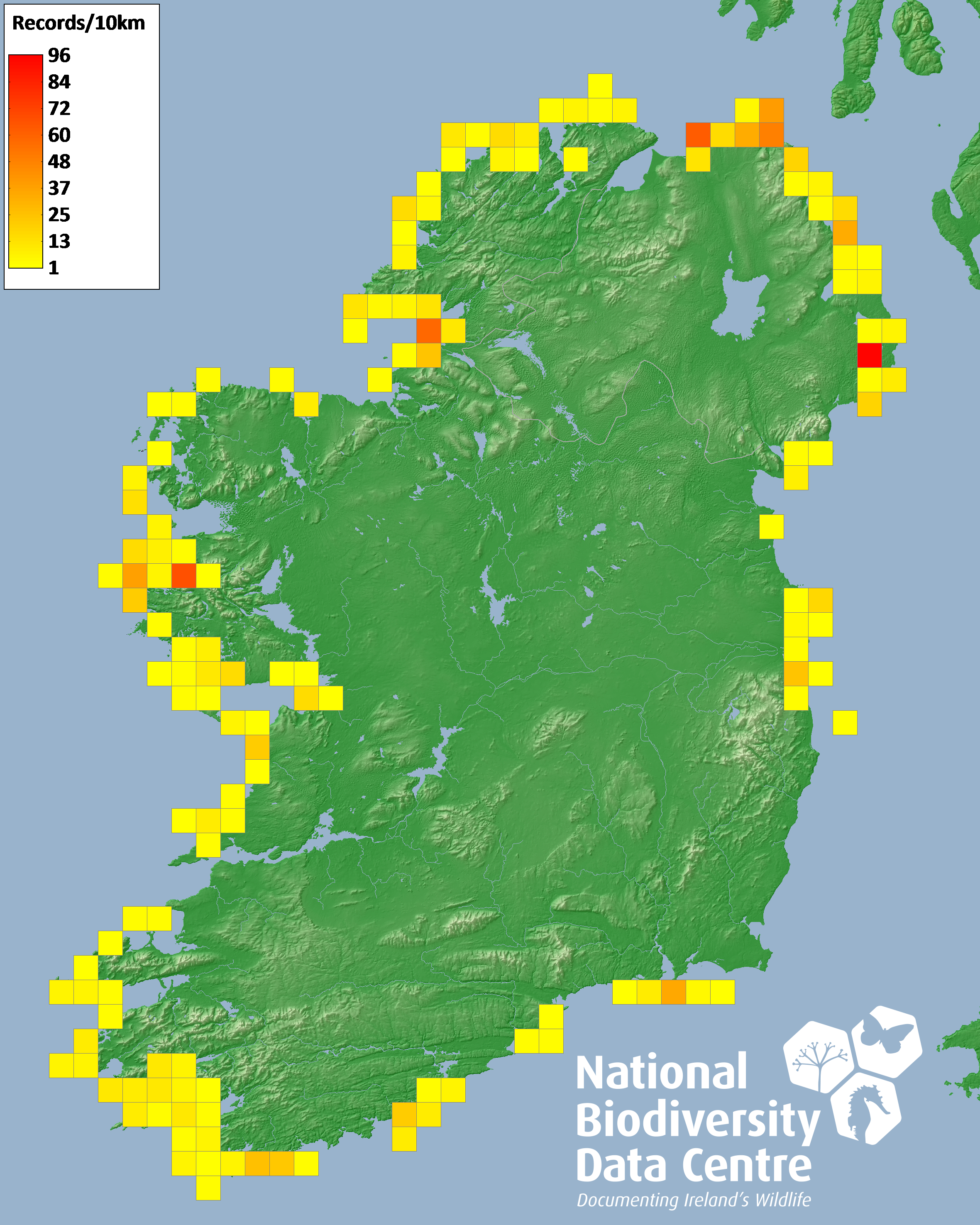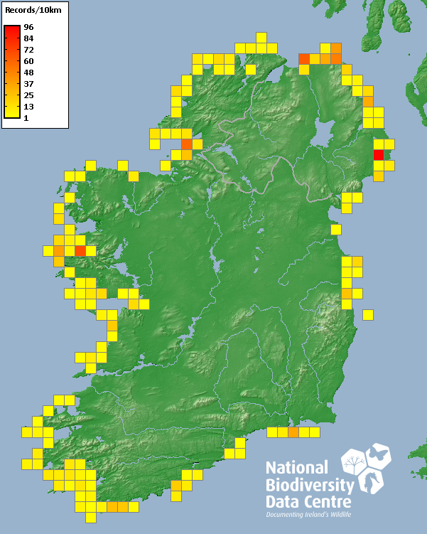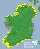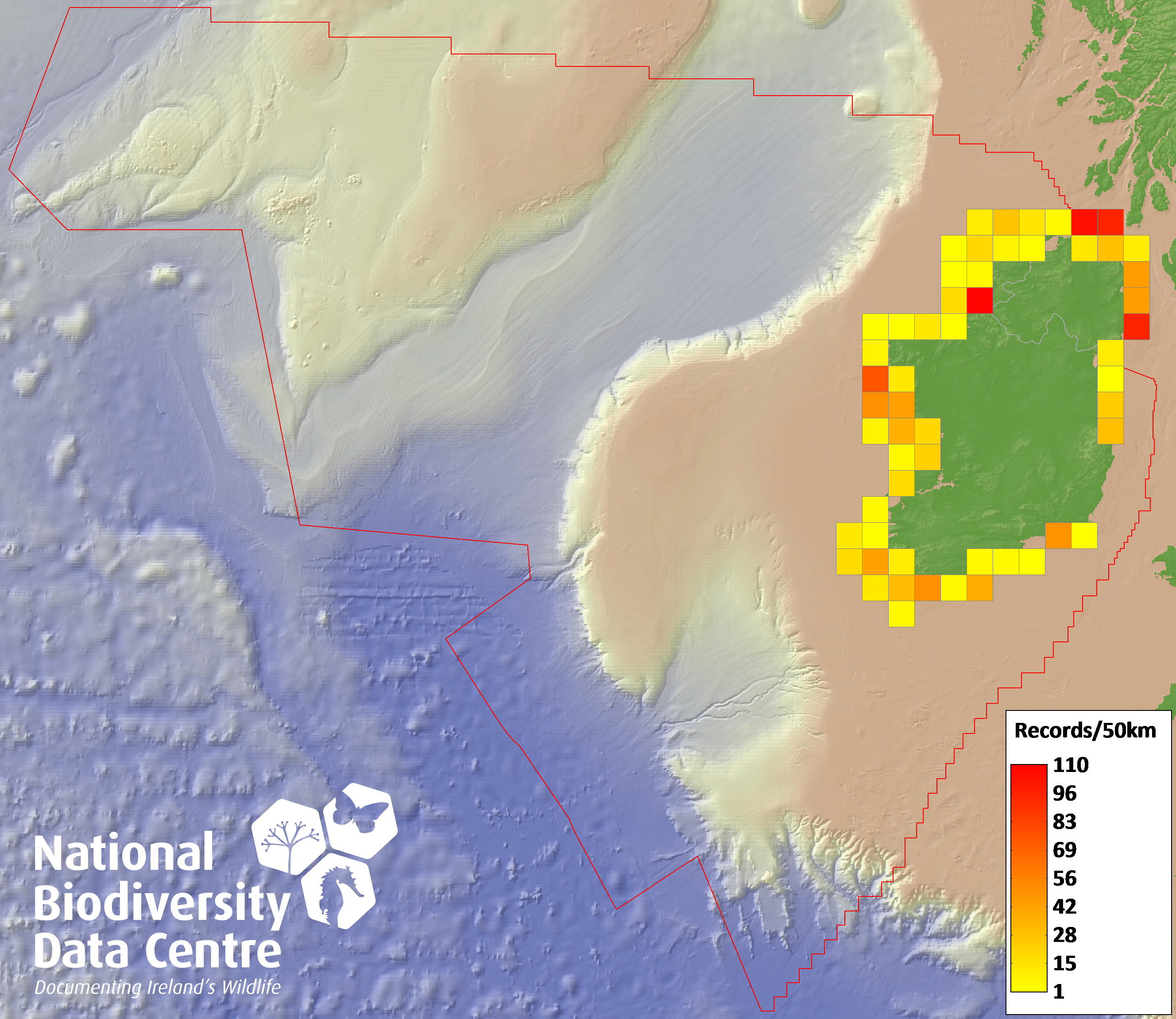 Distribution of the number of records recorded within each 10km grid square (ITM).Marine Map - 50km