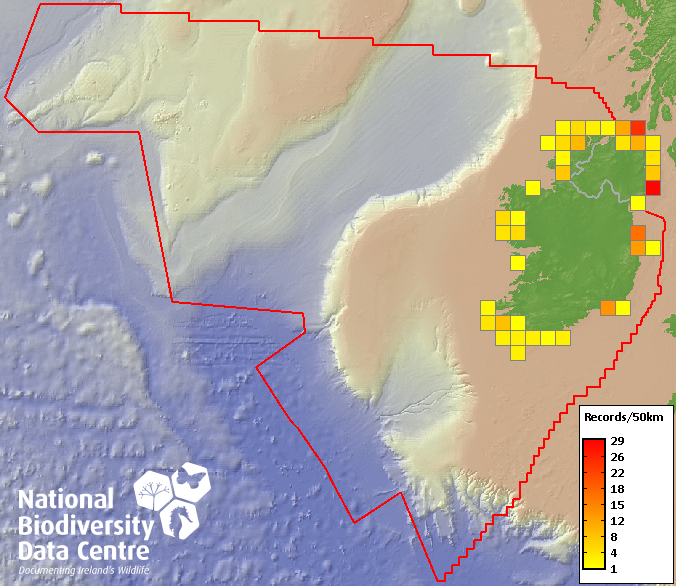 Distribution of the number of records recorded within each 10km grid square (ITM).Marine Map - 50km