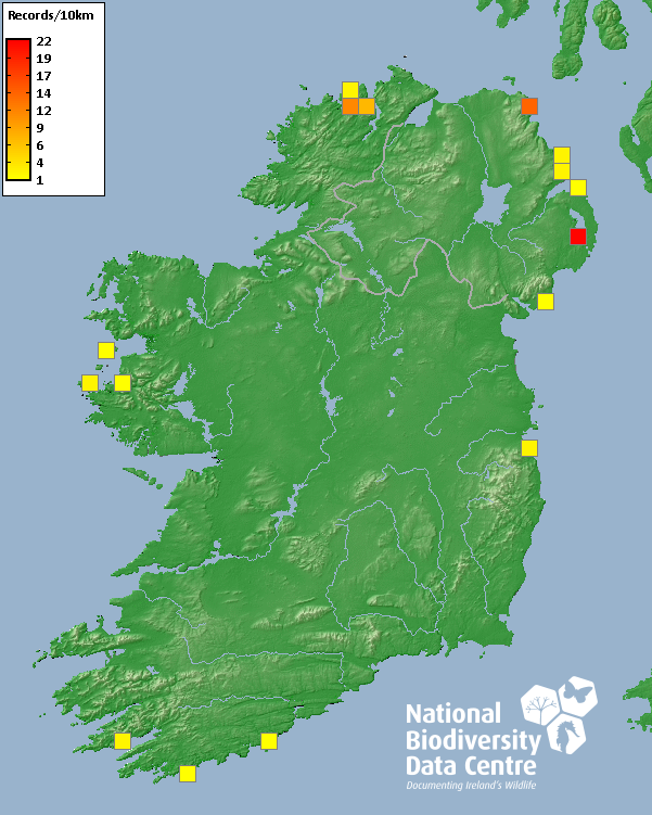 Distribution of the number of records recorded within each 10km grid square (ITM).Marine Map - 50km