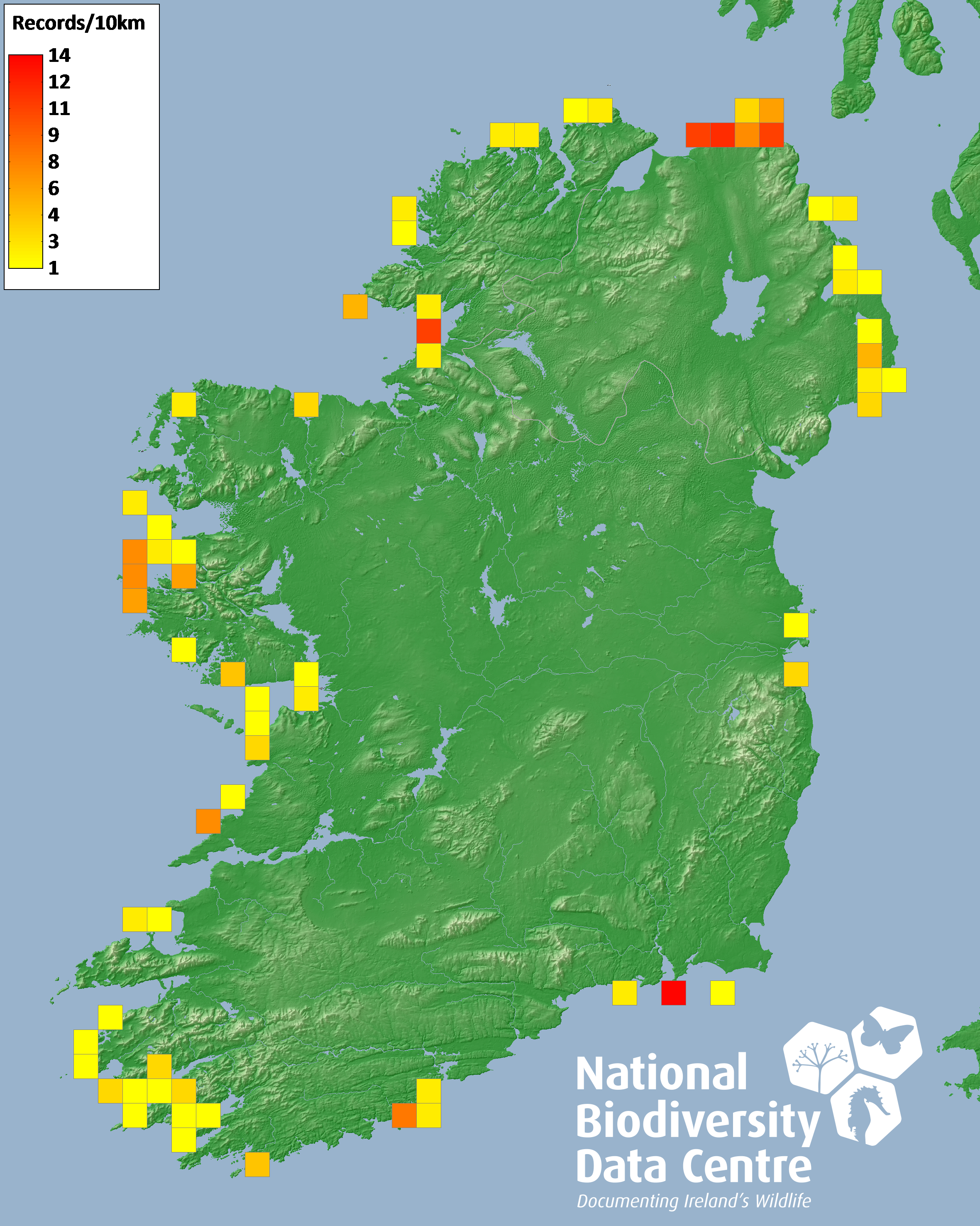 Distribution of the number of records recorded within each 10km grid square (ITM).Marine Map - 50km