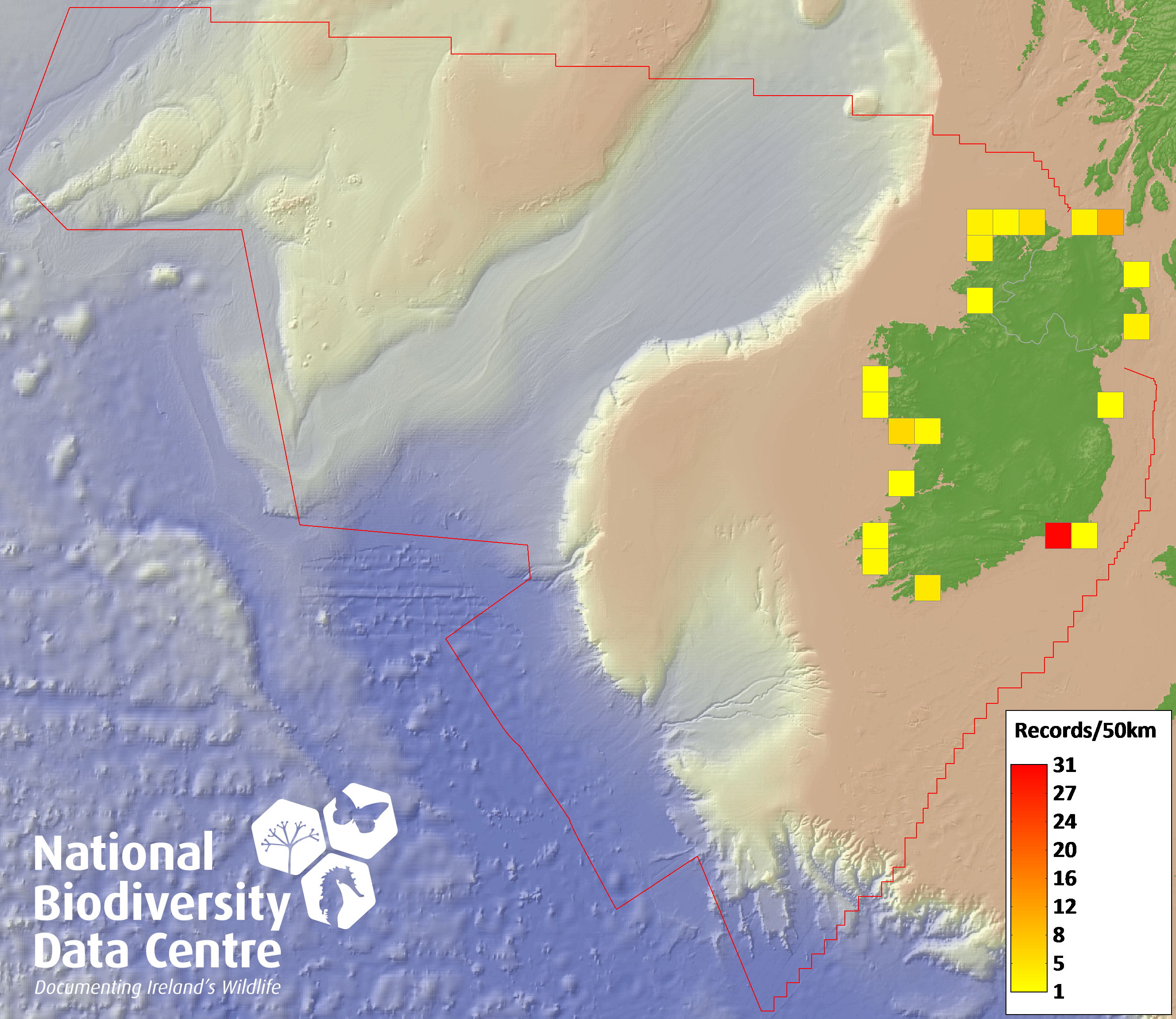 Distribution of the number of records recorded within each 10km grid square (ITM).Marine Map - 50km