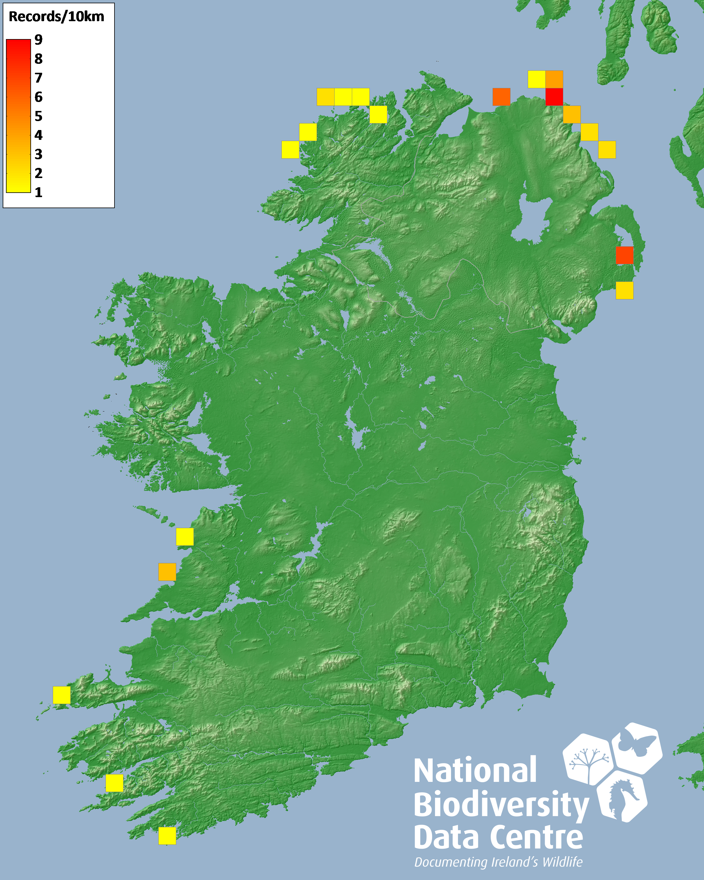 Distribution of the number of records recorded within each 10km grid square (ITM).Marine Map - 50km