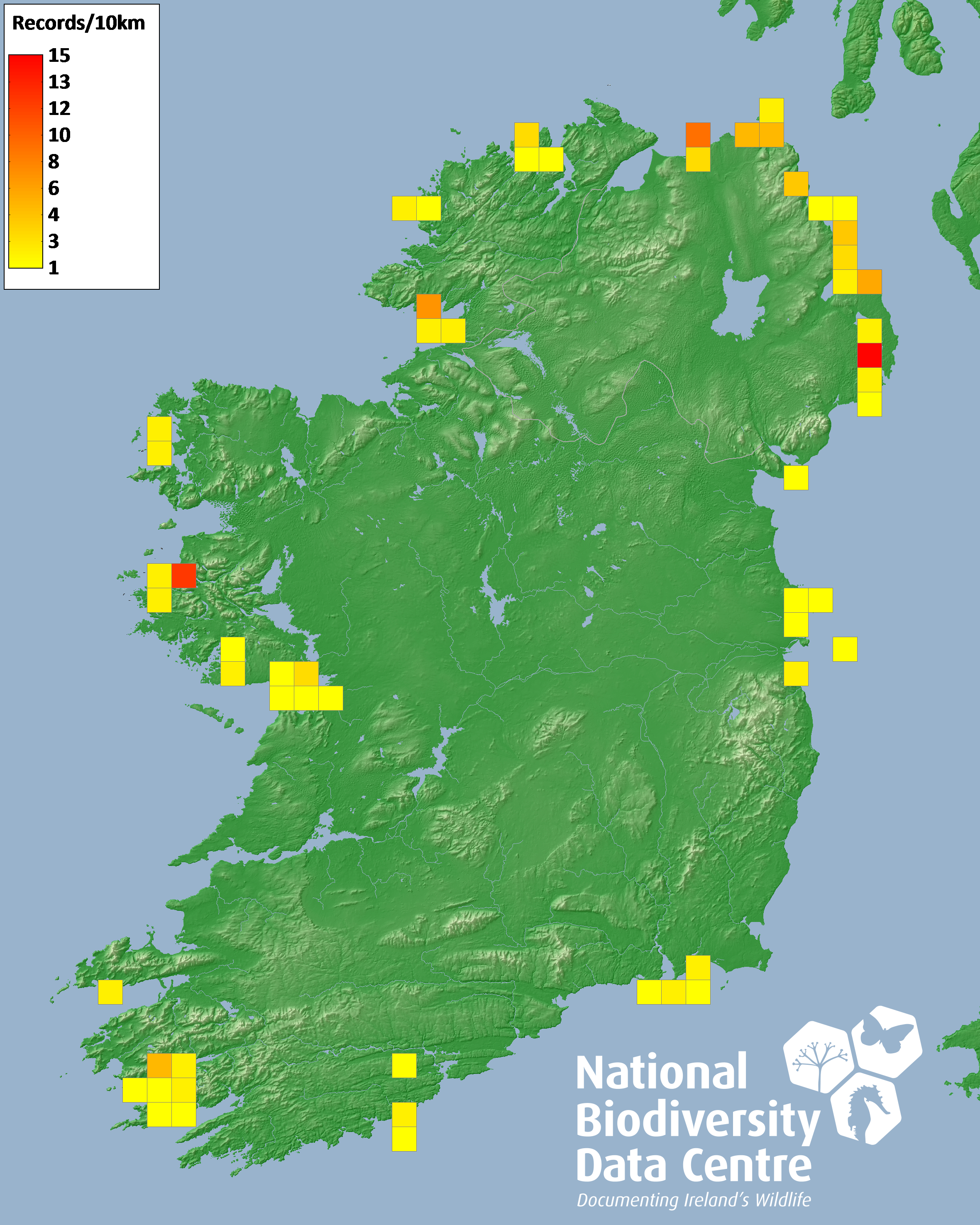 Distribution of the number of records recorded within each 10km grid square (ITM).Marine Map - 50km