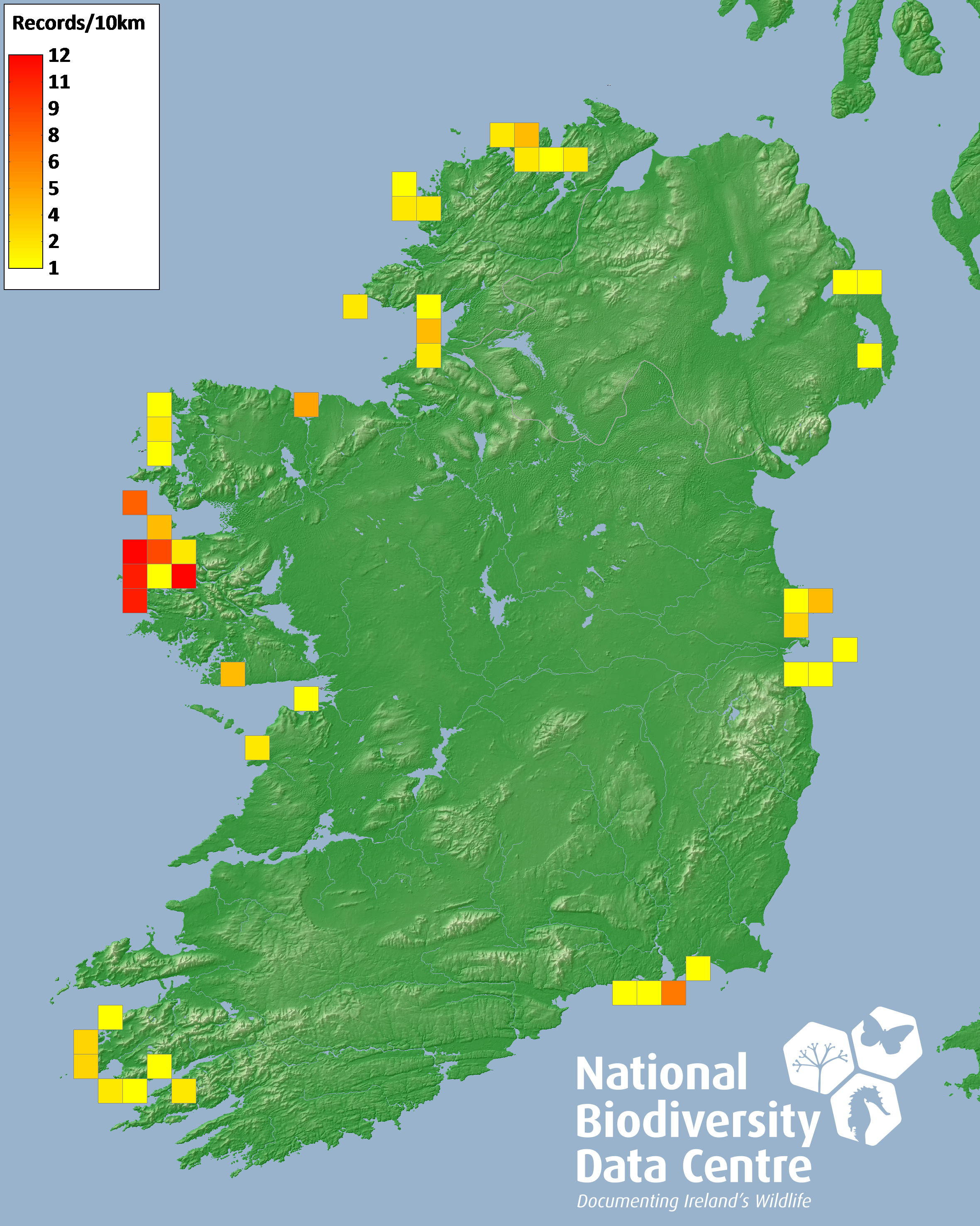 Distribution of the number of records recorded within each 10km grid square (ITM).Marine Map - 50km