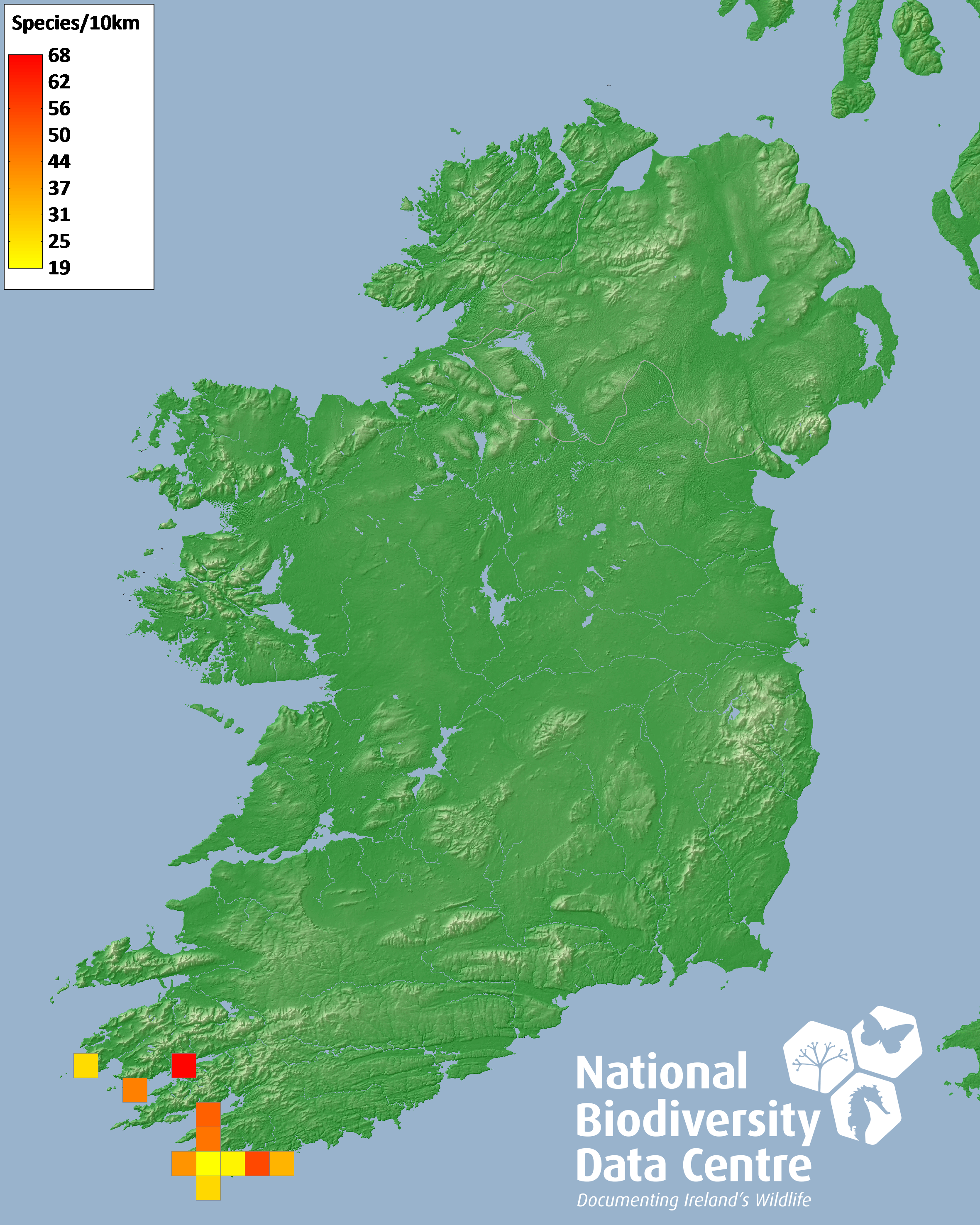 Distribution of the number of species recorded within each 10km grid square (ITM).Marine Map - 50Km