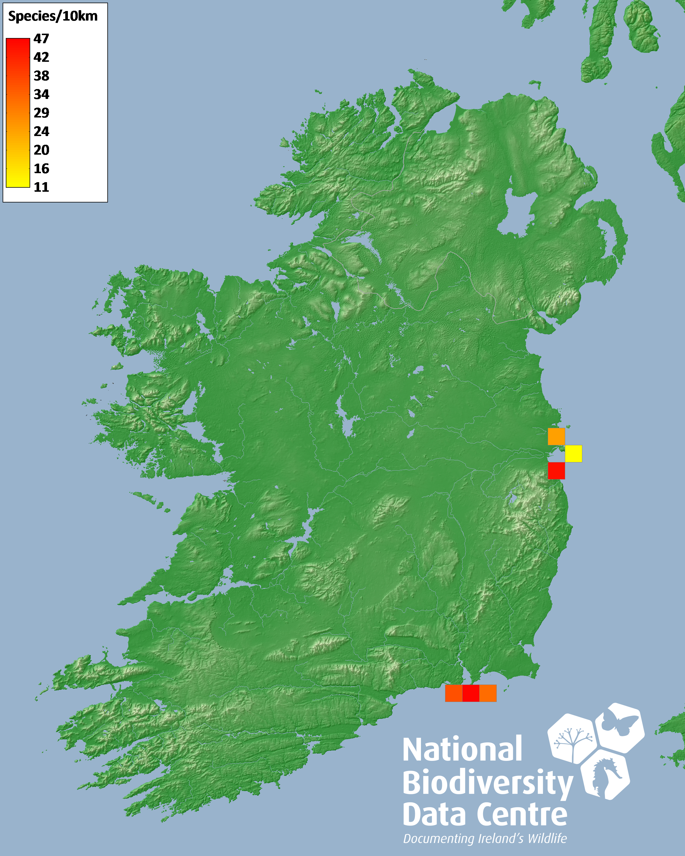 Distribution of the number of species recorded within each 10km grid square (ITM).Marine Map - 50Km